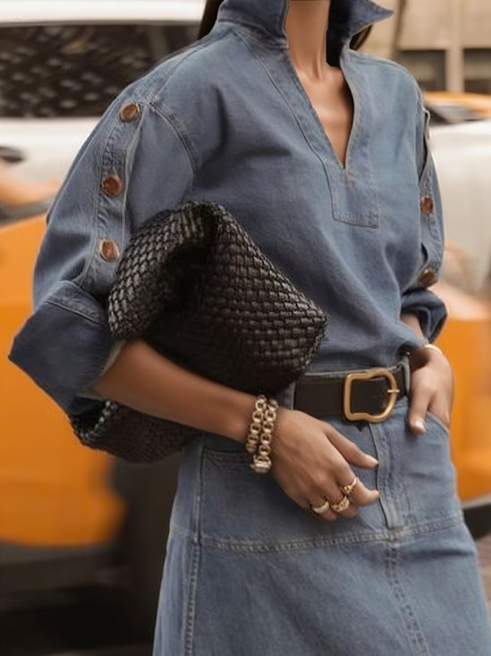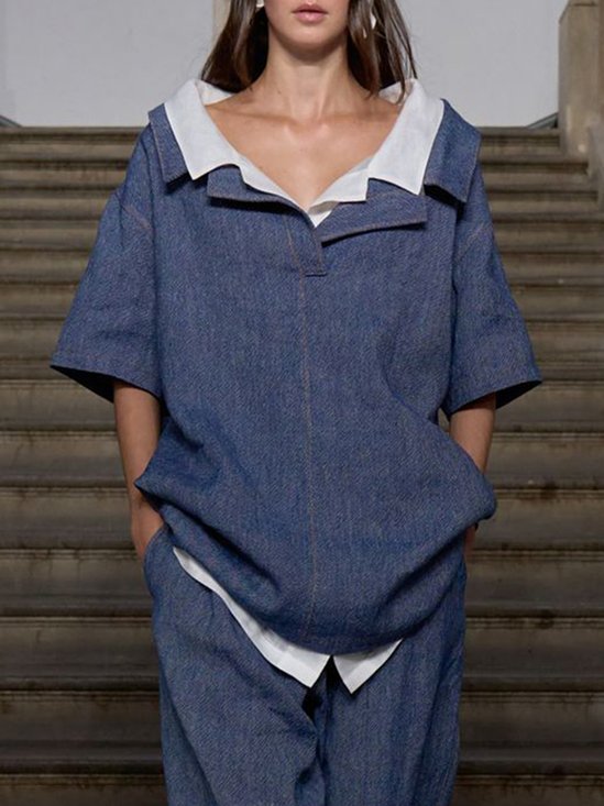 Denim Urban Plain Irregular Craftsmanship Shawl Collar Shirt