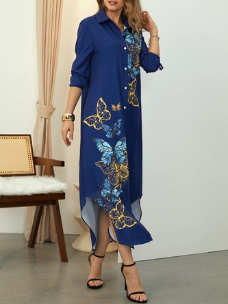 Casual Floral Loosen Shirt Collar Maxi Dress With Belt