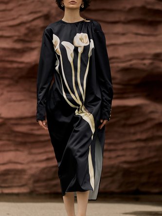 Elegant Loose Stand Collar Long Sleeve Floral Midi Dress