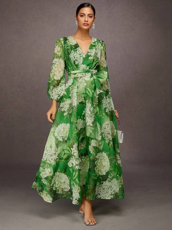 Elegant Floral Printing Shawl Collar Maxi Dress