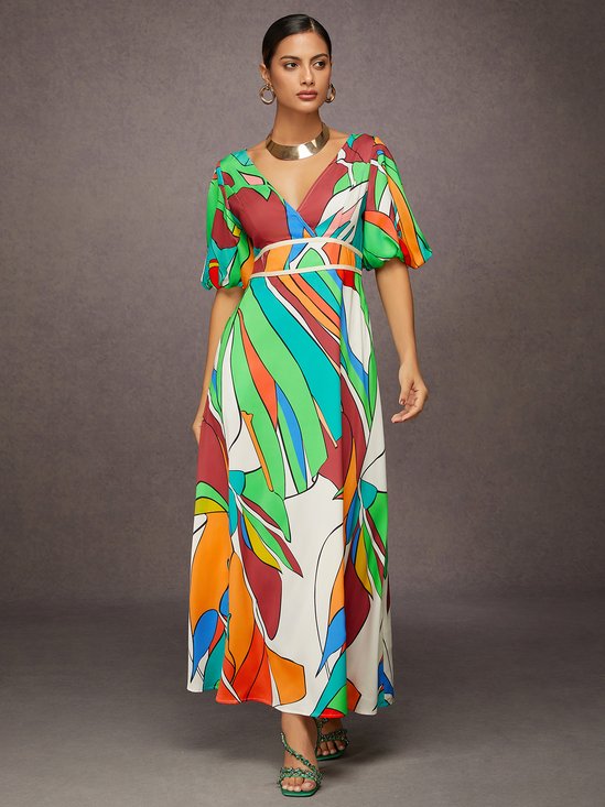 Elegant Gradient Pattern Balloon Sleeve Printing V Neck Maxi Dress