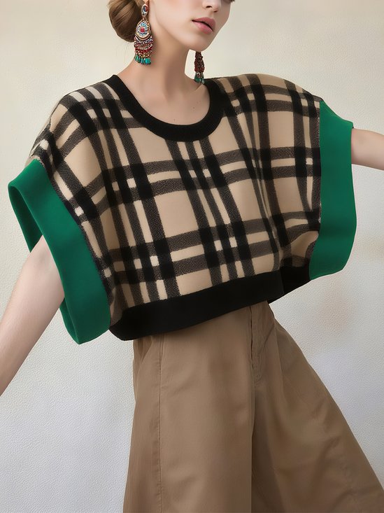 Plaid Casual Raglan Sleeve Loosen Crew Neck Sweater