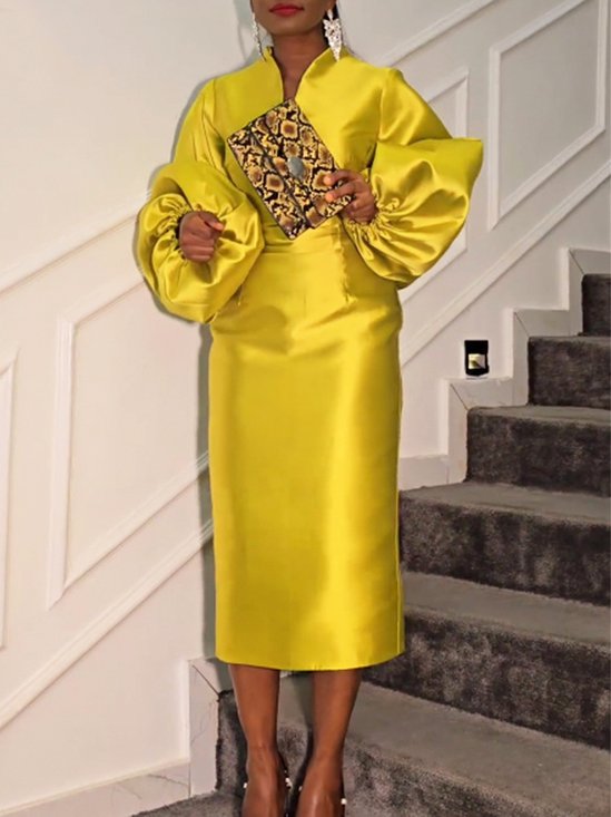 Elegant Floral Balloon Sleeve Printing Stand Collar Party Midi Dress