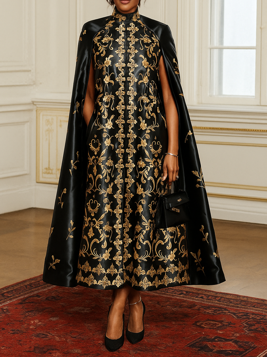Elegant 3D Floral Plain Stand Collar Midi Dress