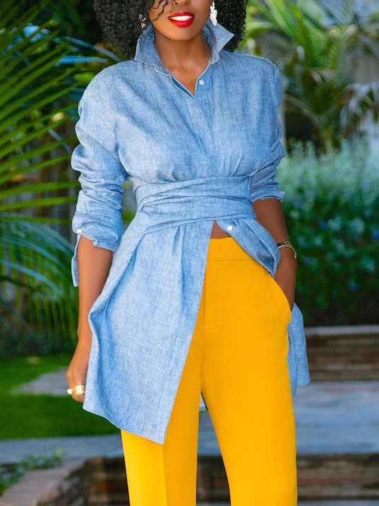 Plain Urban Shirt Collar Faux Denim Blouse