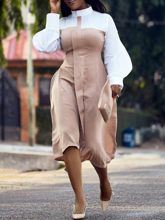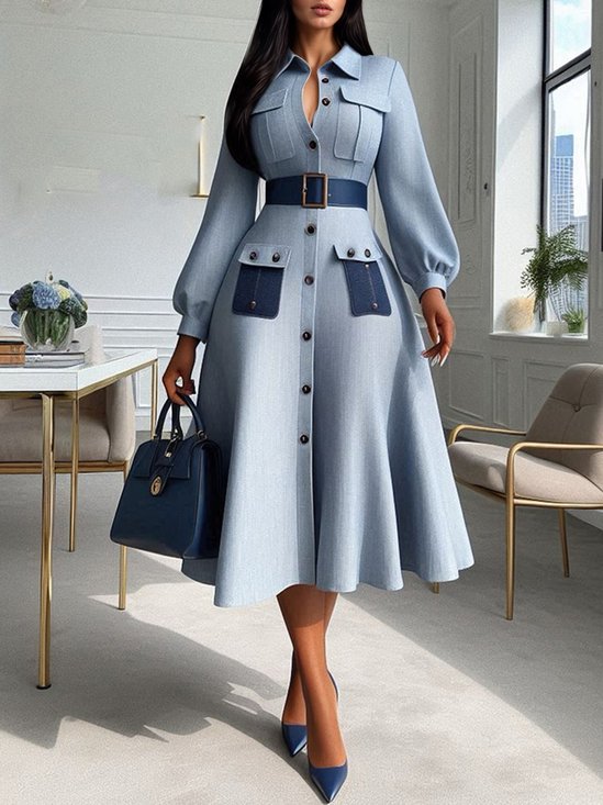 Urban Color Block Split Joint Shirt Collar Knee Length Dress