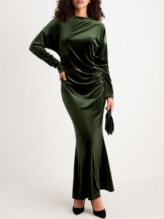 Elegant Regular Fit Stand Collar Plain Dress With Brooch
