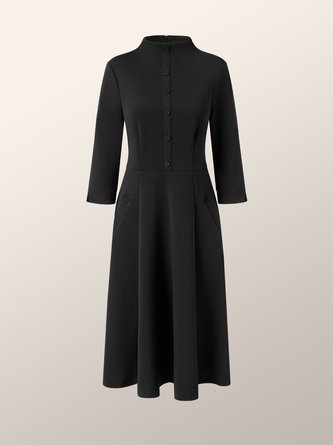 Elegant Regular Fit Stand Collar Plain Dress With Brooch