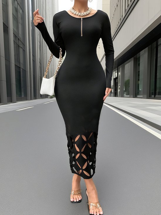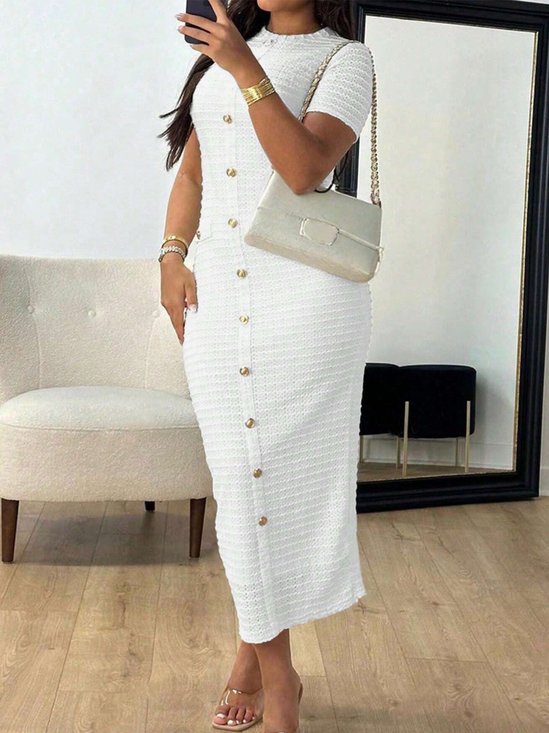 Elegant Plain Buttoned Lapel Collar Knee Length Dress