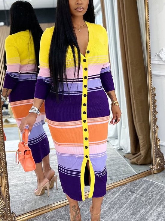 Elegant Color Block Buttoned Shawl Collar Knee Length Dress