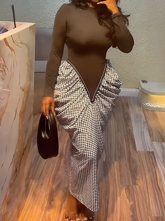 Elegant Color Block Shirt Collar Maxi Dress No Belt