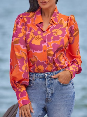 Elegant Floral Printing Shirt Collar Puff Sleeve Shirt