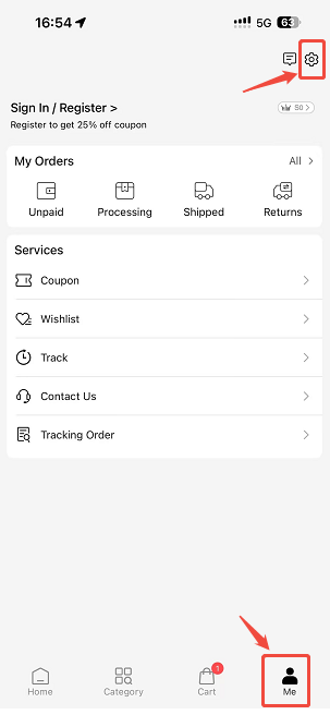 Step 1:Scroll to page "Me" and select "Setting"icon