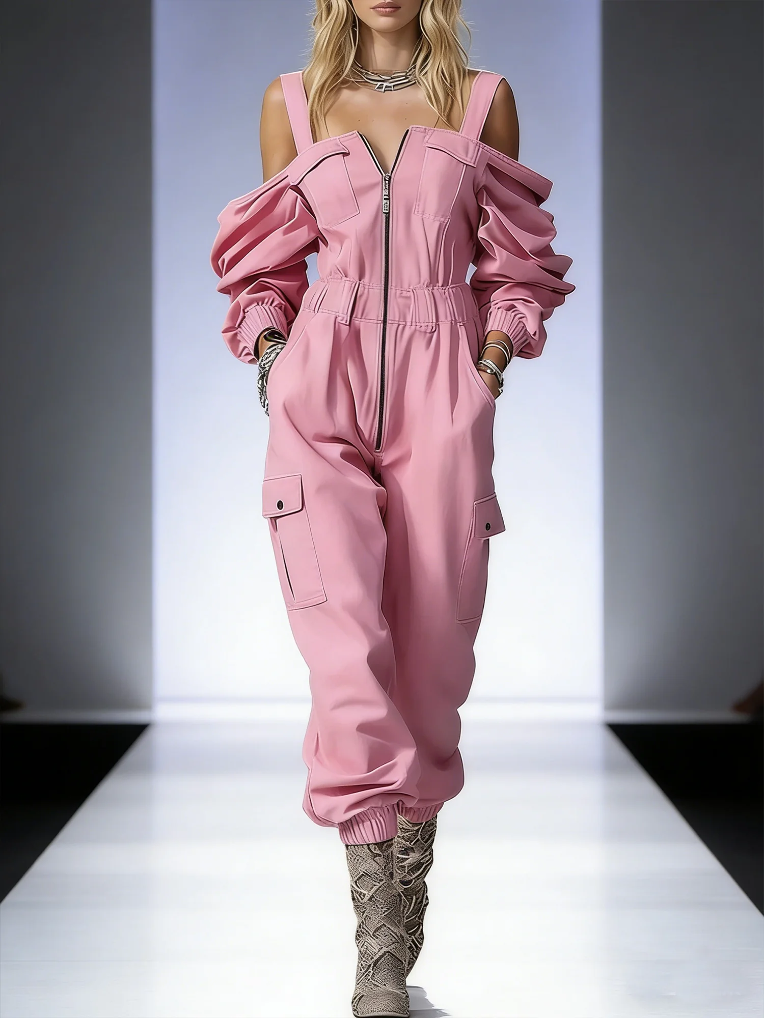 Casual Off Shoulder Sleeve Pockets Plain Zipper Jumpsuit