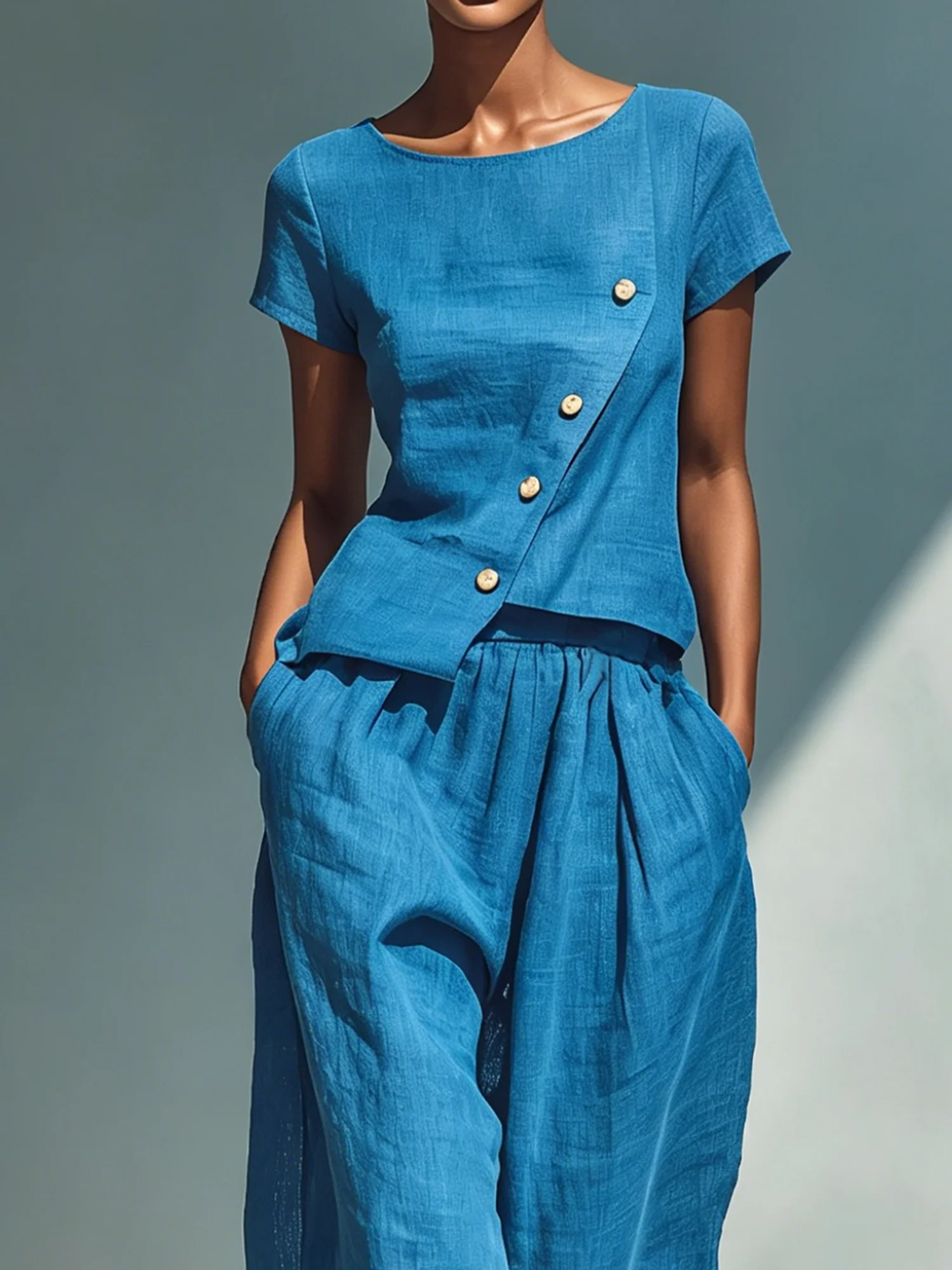Cotton And Linen Casual Plain Irregular Craftsmanship Crew Neck Blouse