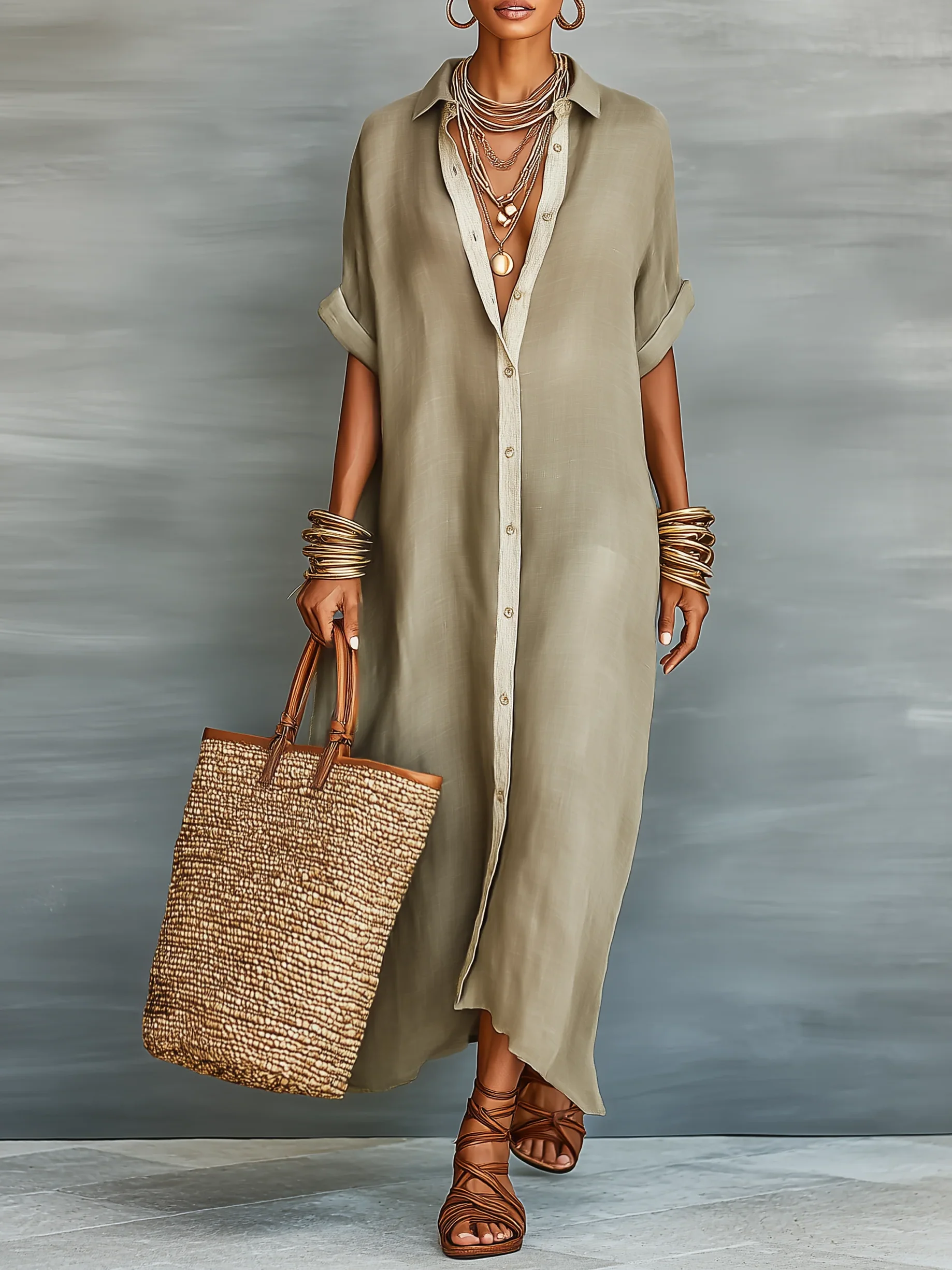 Cotton Casual Color Block Buttoned Shirt Collar Maxi Dress