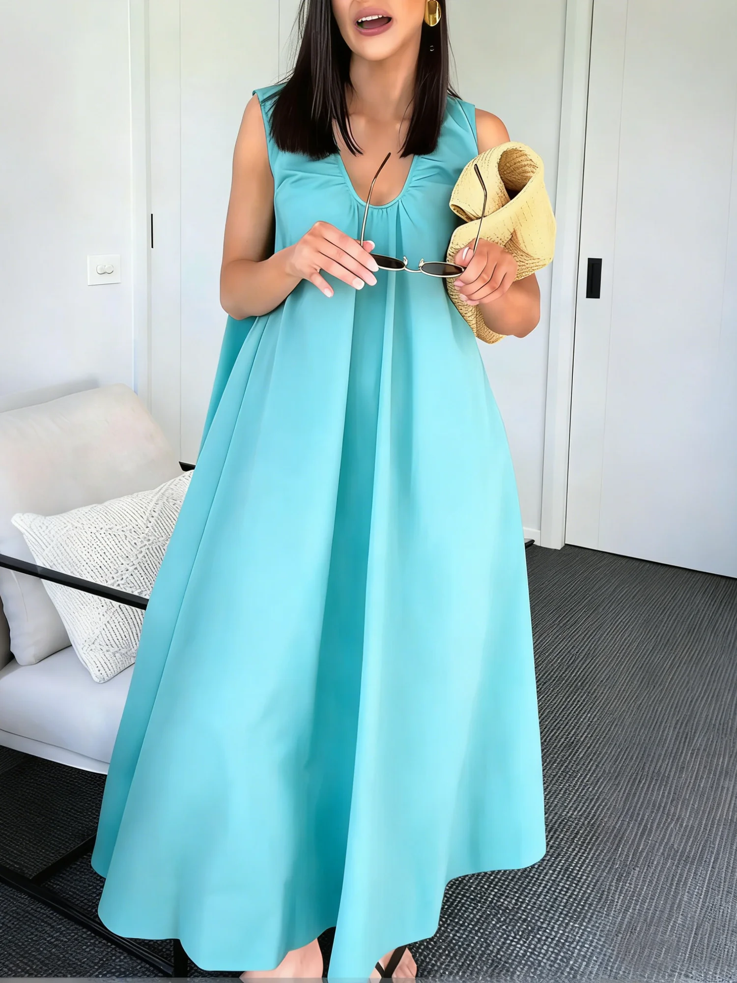Cotton Casual Plain U-Neck Loosen Maxi Dress