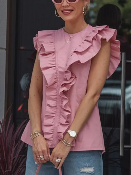Cotton Vacation Plain Peplum Crew Neck Blouse