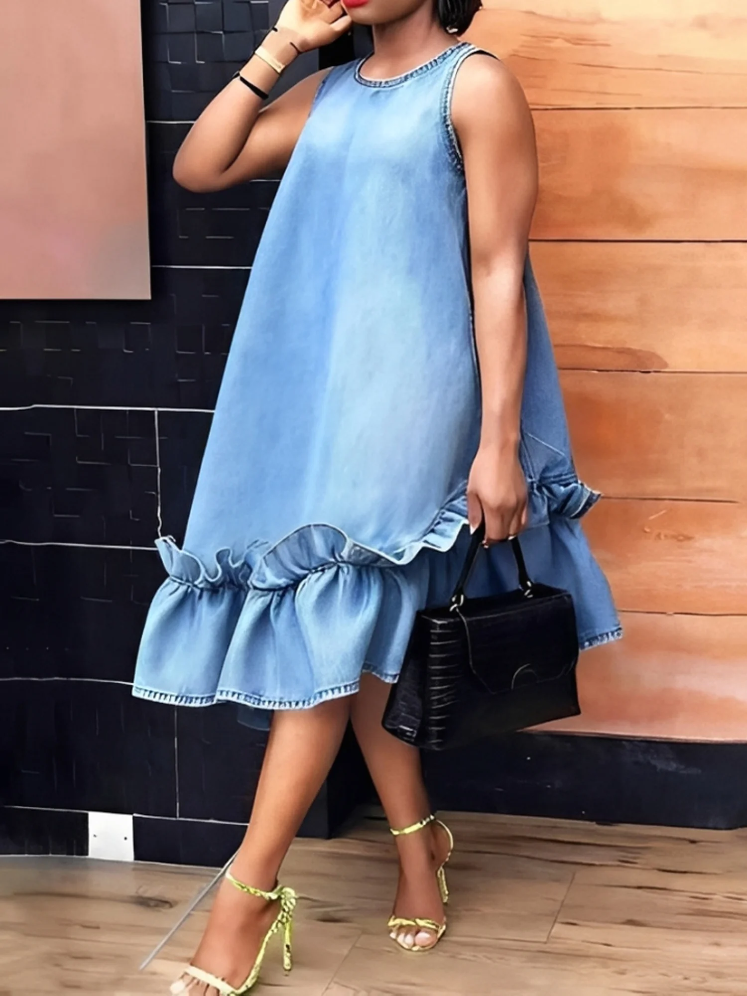 Denim Urban Plain Peplum Crew Neck Midi Dress