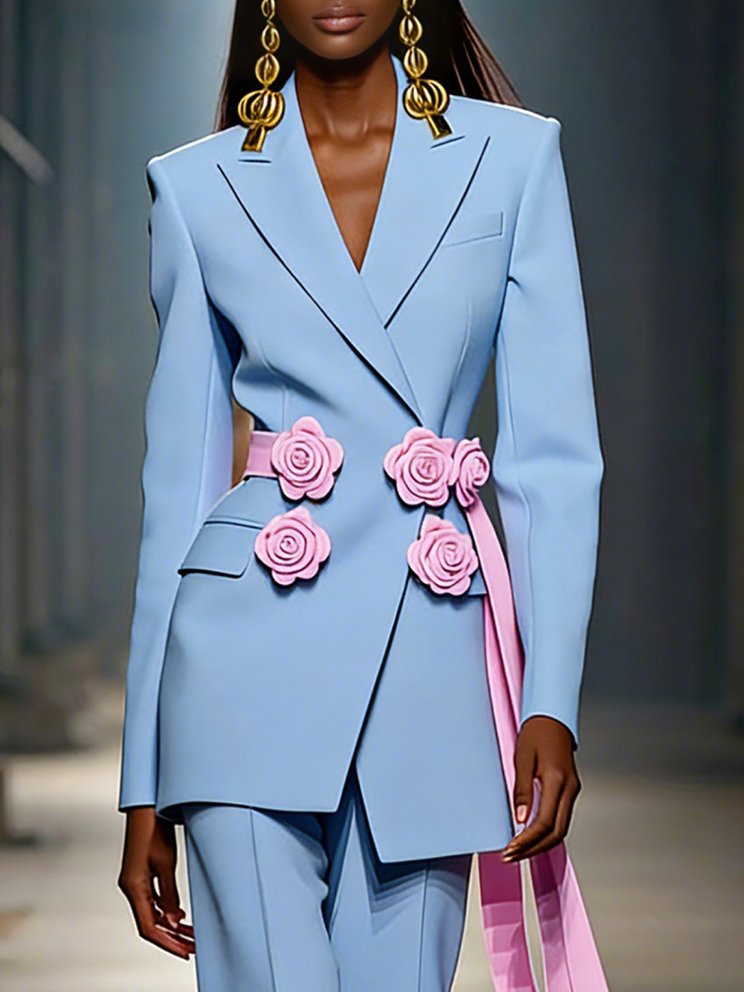 Elegant 3D Floral Plain Lapel Collar Blazer With Belt