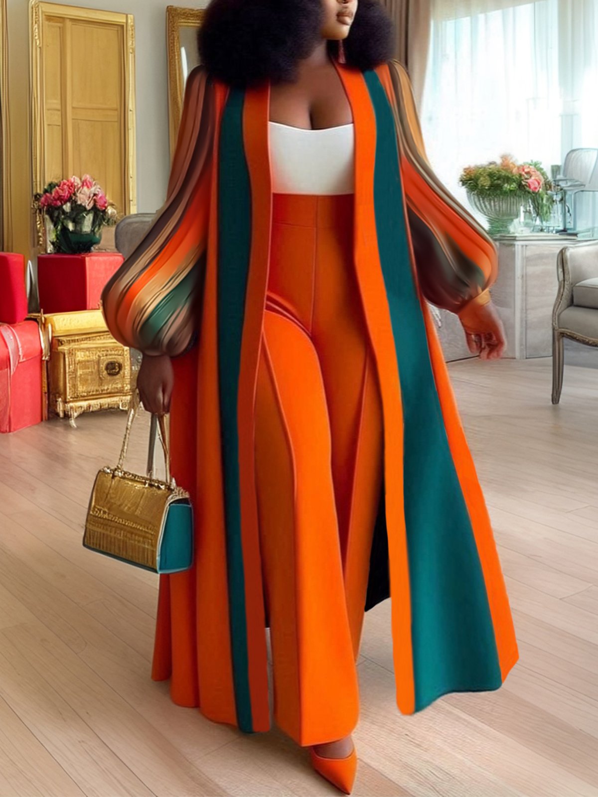 The bold color blocking and dramatic balloon sleeves add a touch of drama to the classic kimono silhouette.