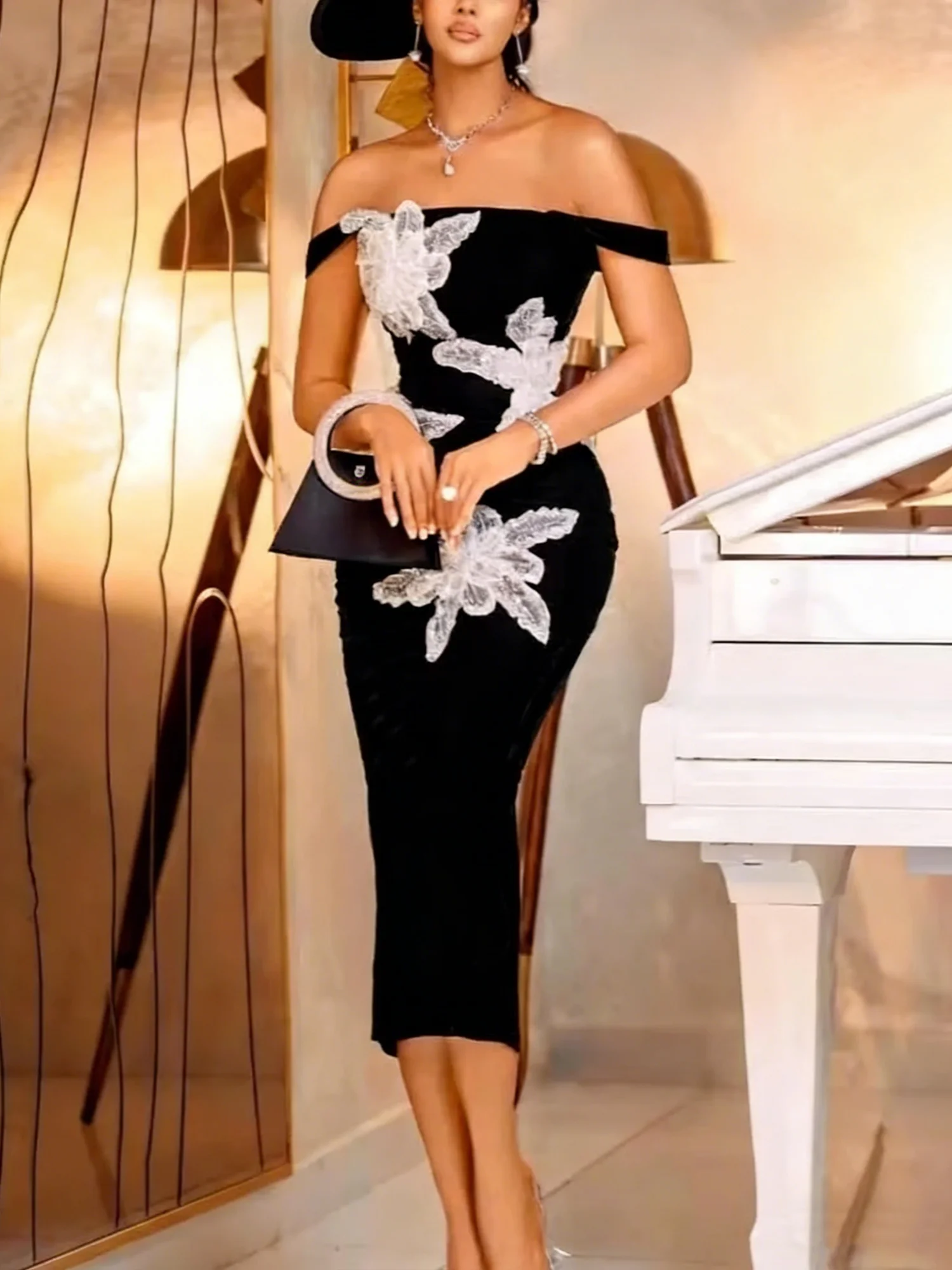 Elegant Color Block 3D Floral Cold Shoulder Midi Dress