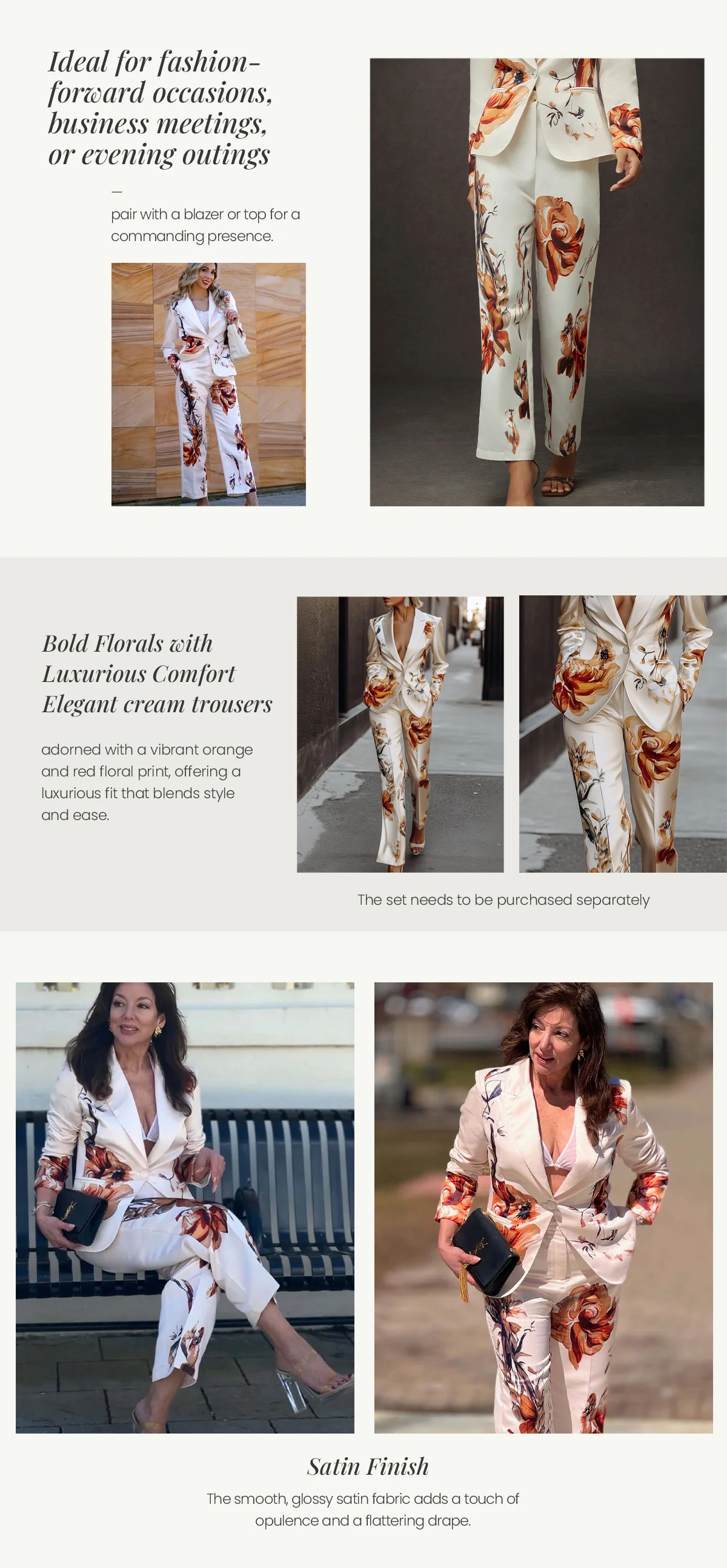 Designed for effortless elegance, these satin floral straight-leg pants offer a flattering fit with a luxurious sheen. Featuring dual side pockets, they seamlessly transition from formal events to stylish everyday wear.