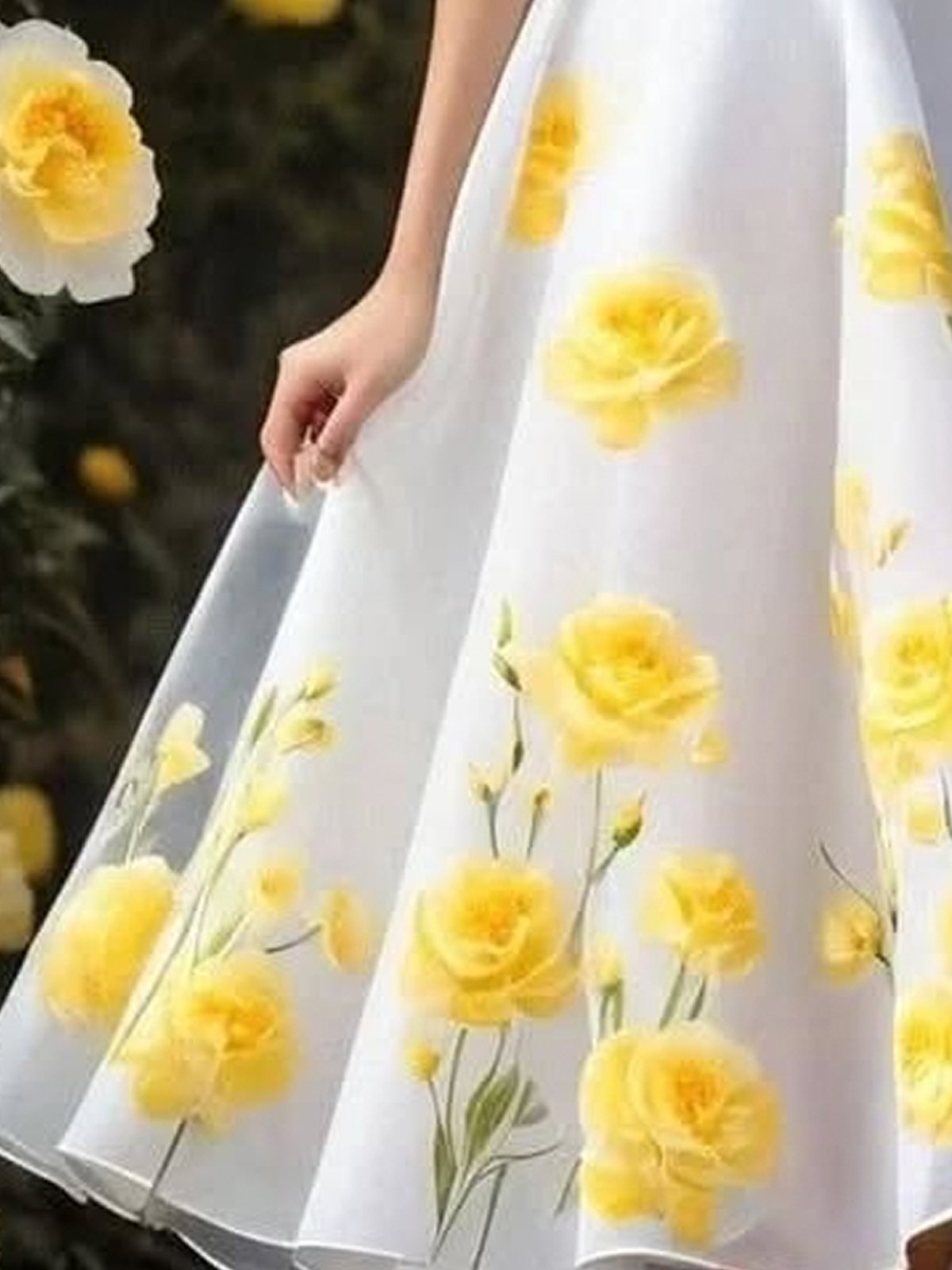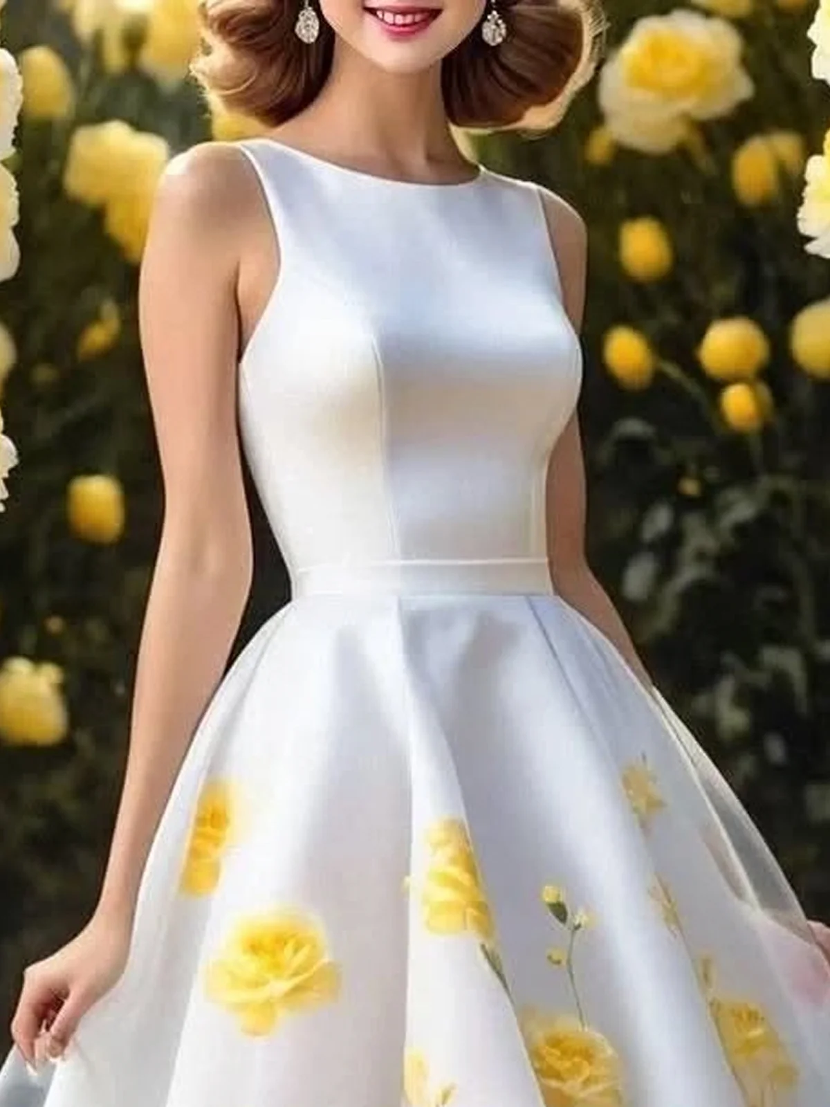 Elegant Floral Printing Crew Neck Knee Length Party Dress