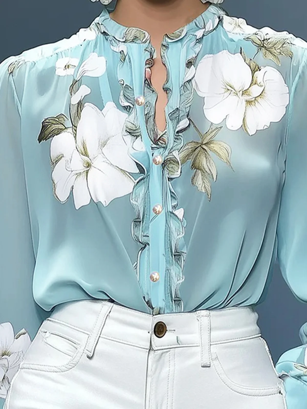 Its lightweight, sheer fabric, sophisticated stand collar, and chic balloon sleeves offer ultimate comfort and a relaxed, refined fit for any occasion.