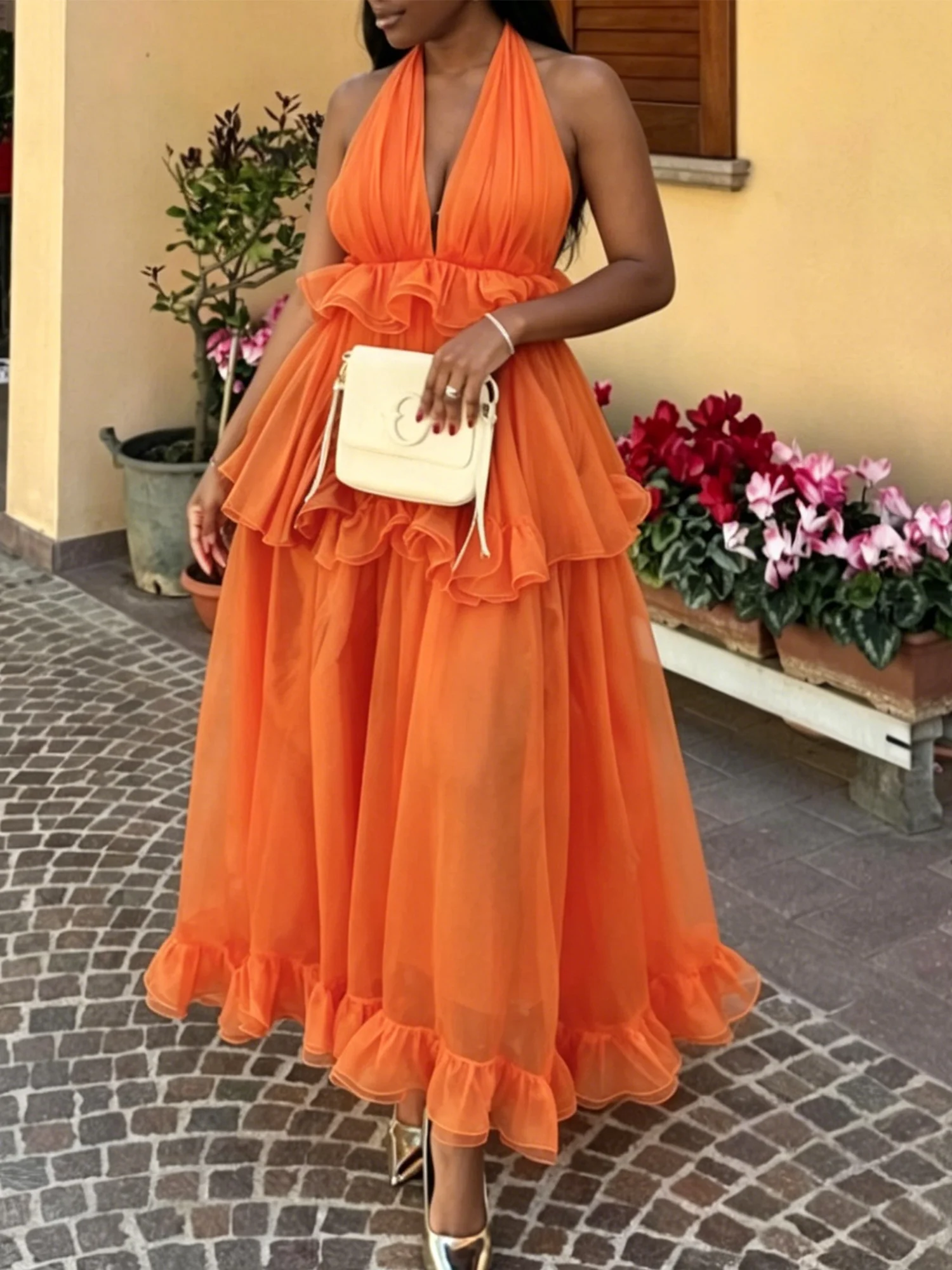 Elegant Plain Peplum V Neck Maxi Dress