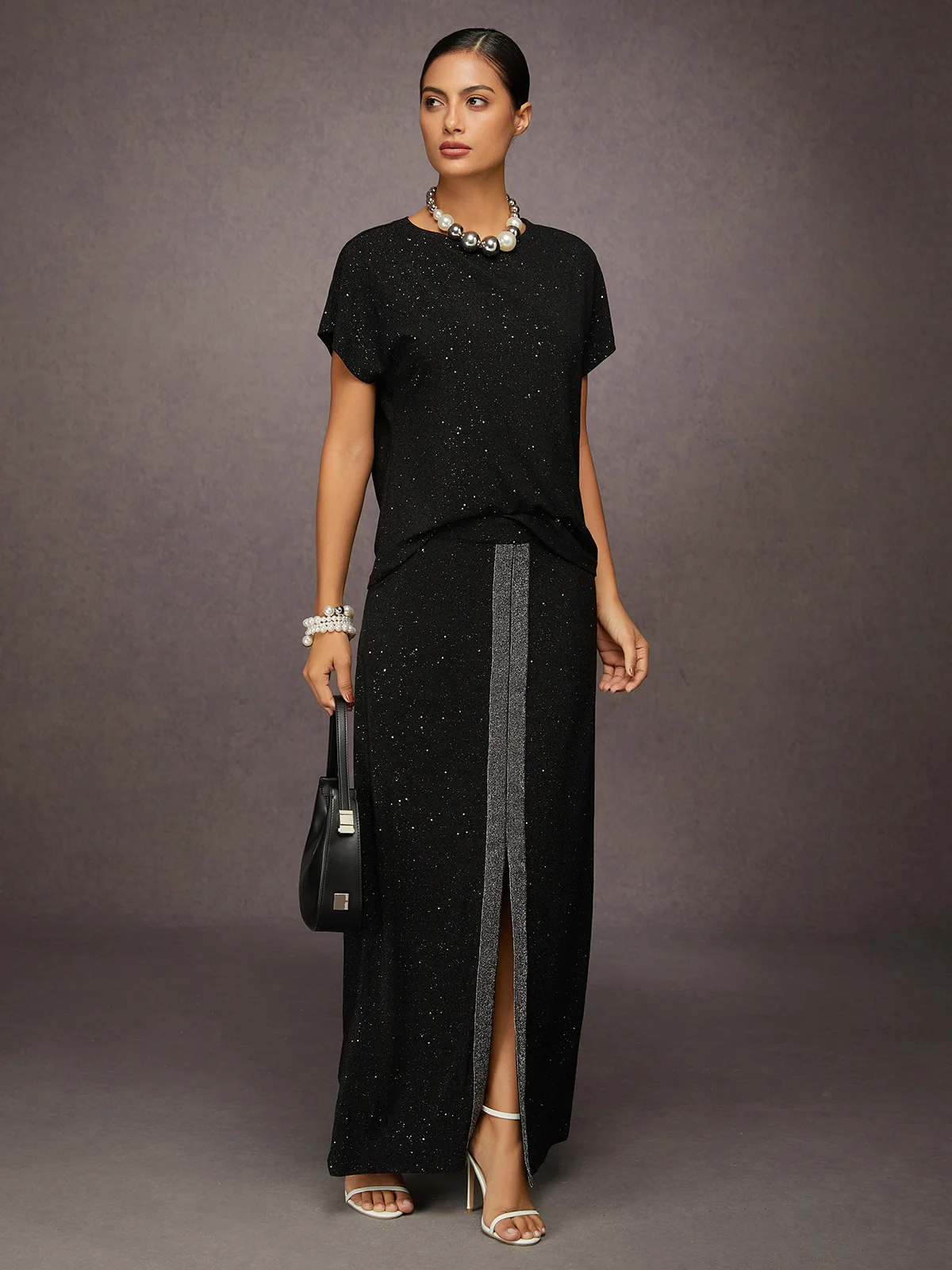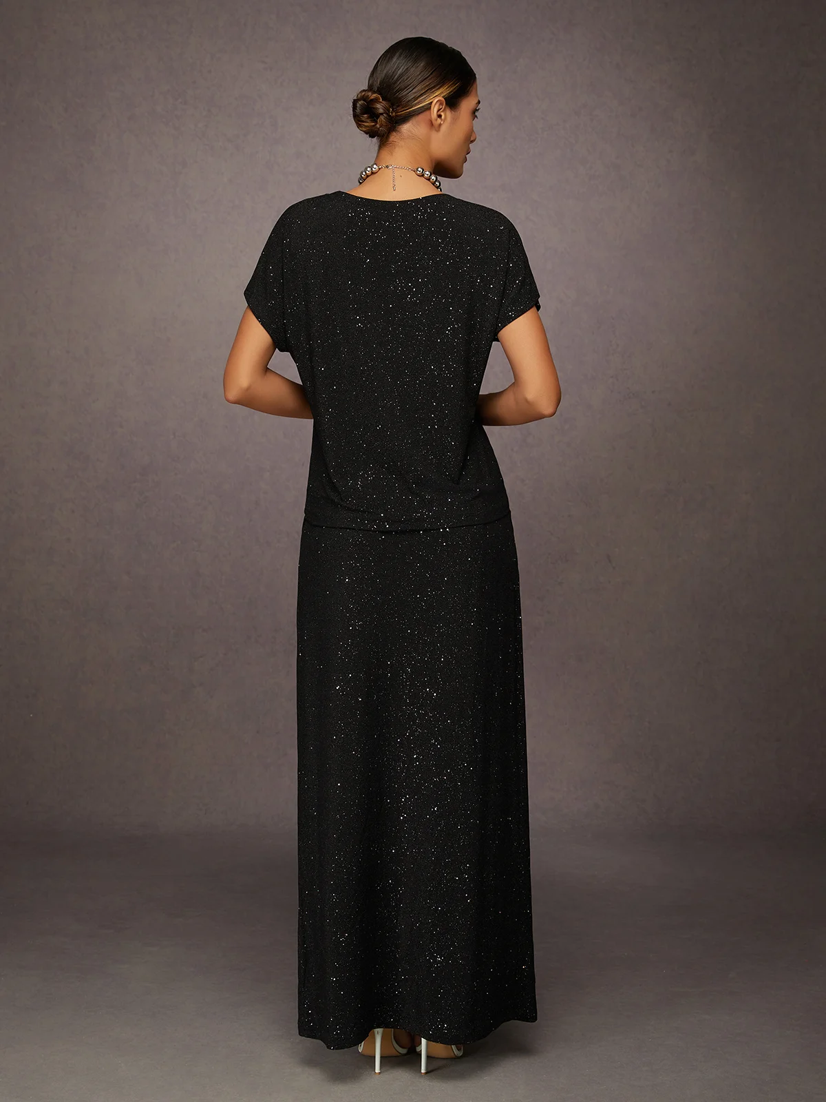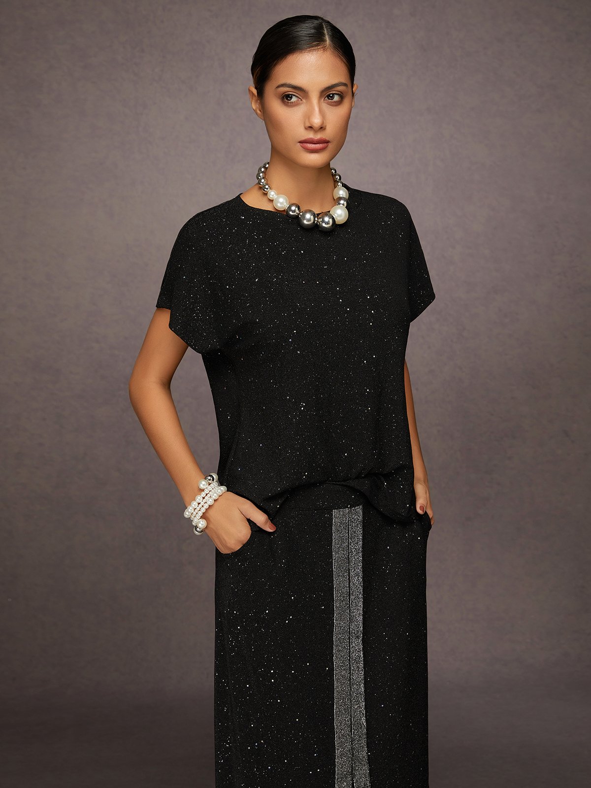 This blouse features a silver-stamped design and a raglan sleeve. Its stretchy fabric and classic crew neck make it perfect for everyday wear or parties.