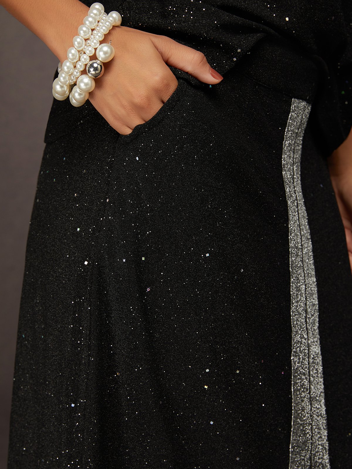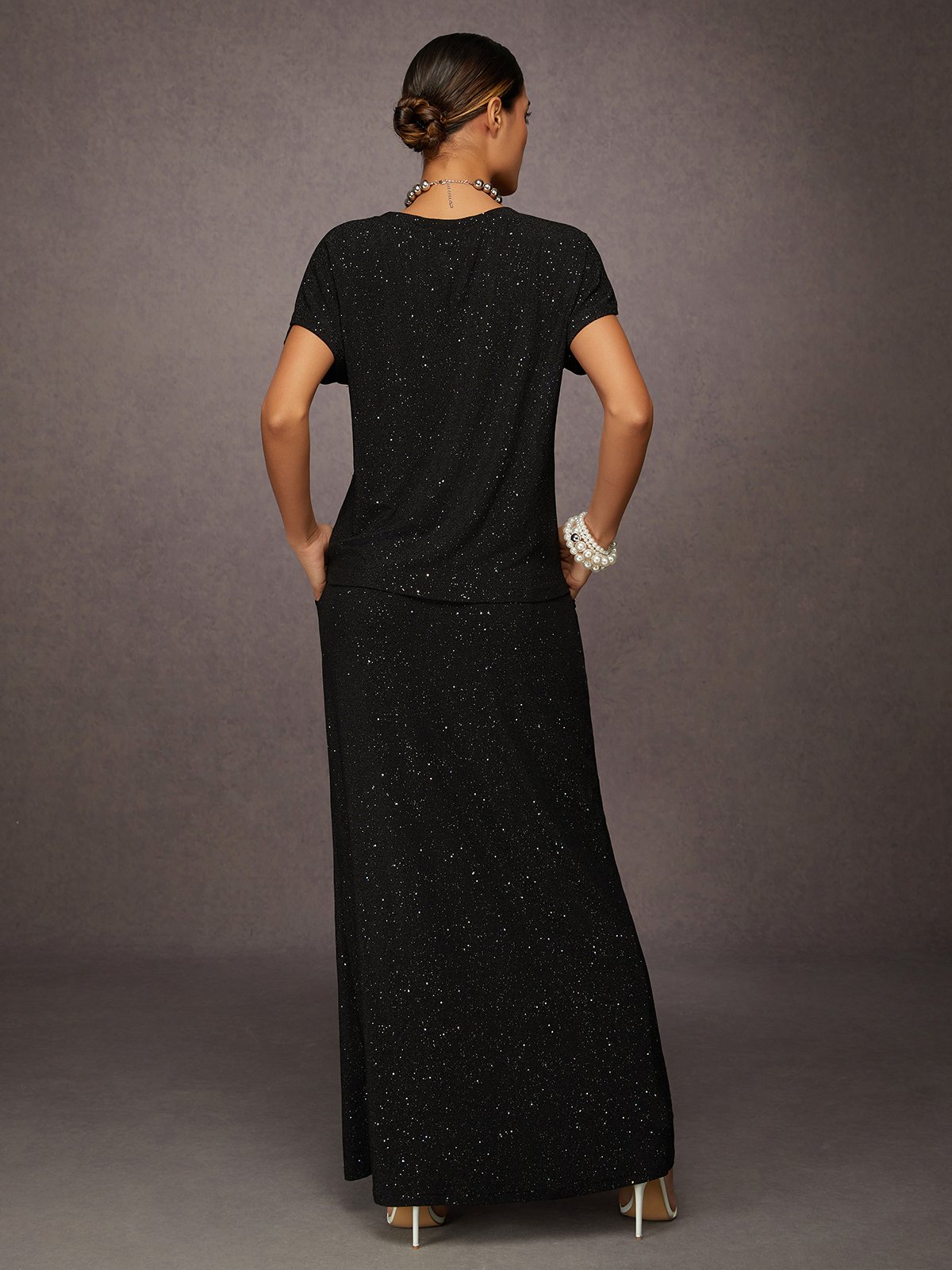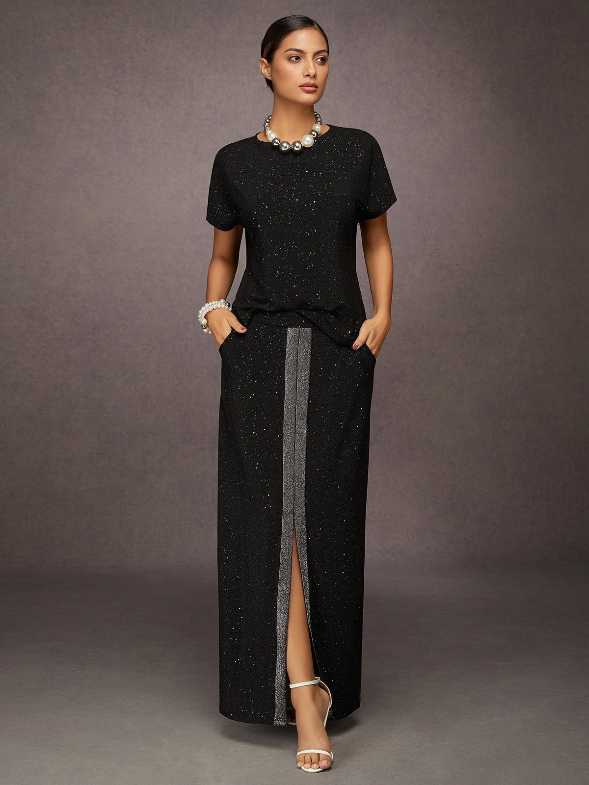 This skirt is designed with a silver-stamped pattern, a side slit, and stretchy fabric for ease of movement. It’s versatile enough for everyday wear and adds a touch of glamour to any gathering.