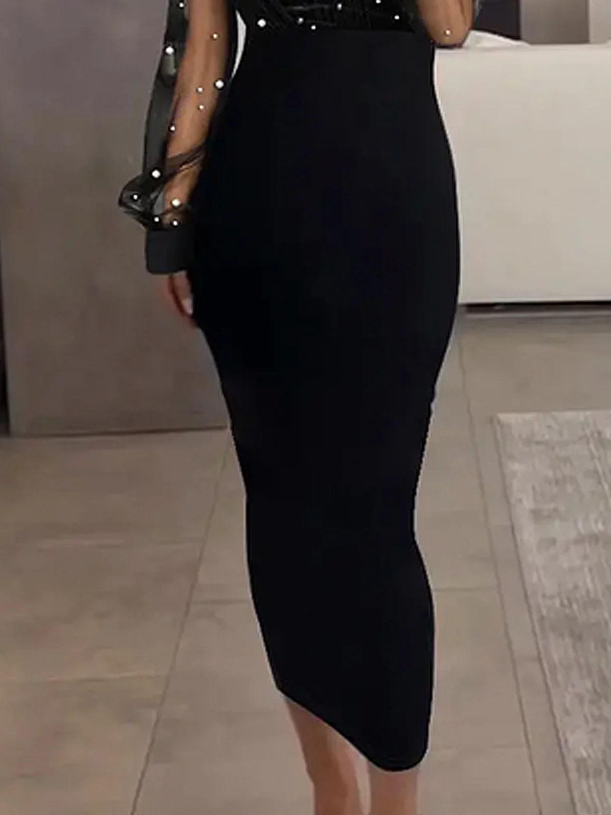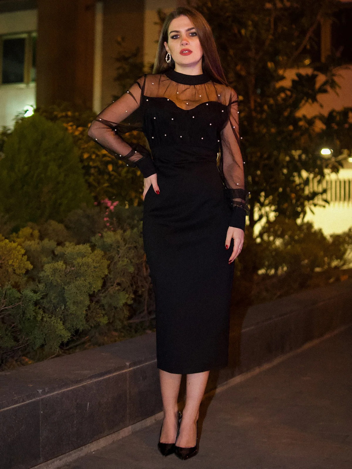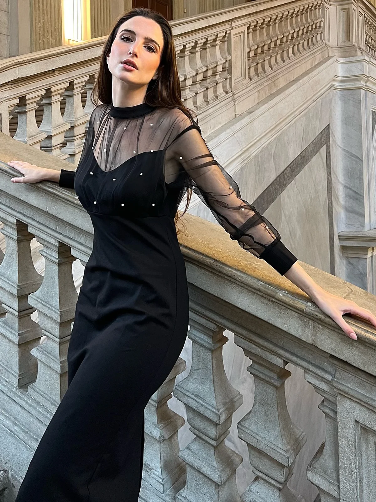 Elevate your eveningwear collection with this pearl-embellished maxi dress, a testament to timeless glamour and modern design.