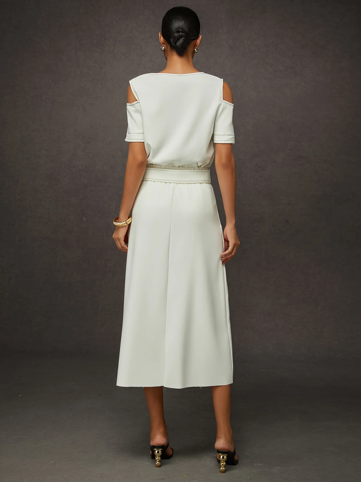 Adjustable drawstring waist, classic A-line skirt with line pattern, versatile for casual and office styles.