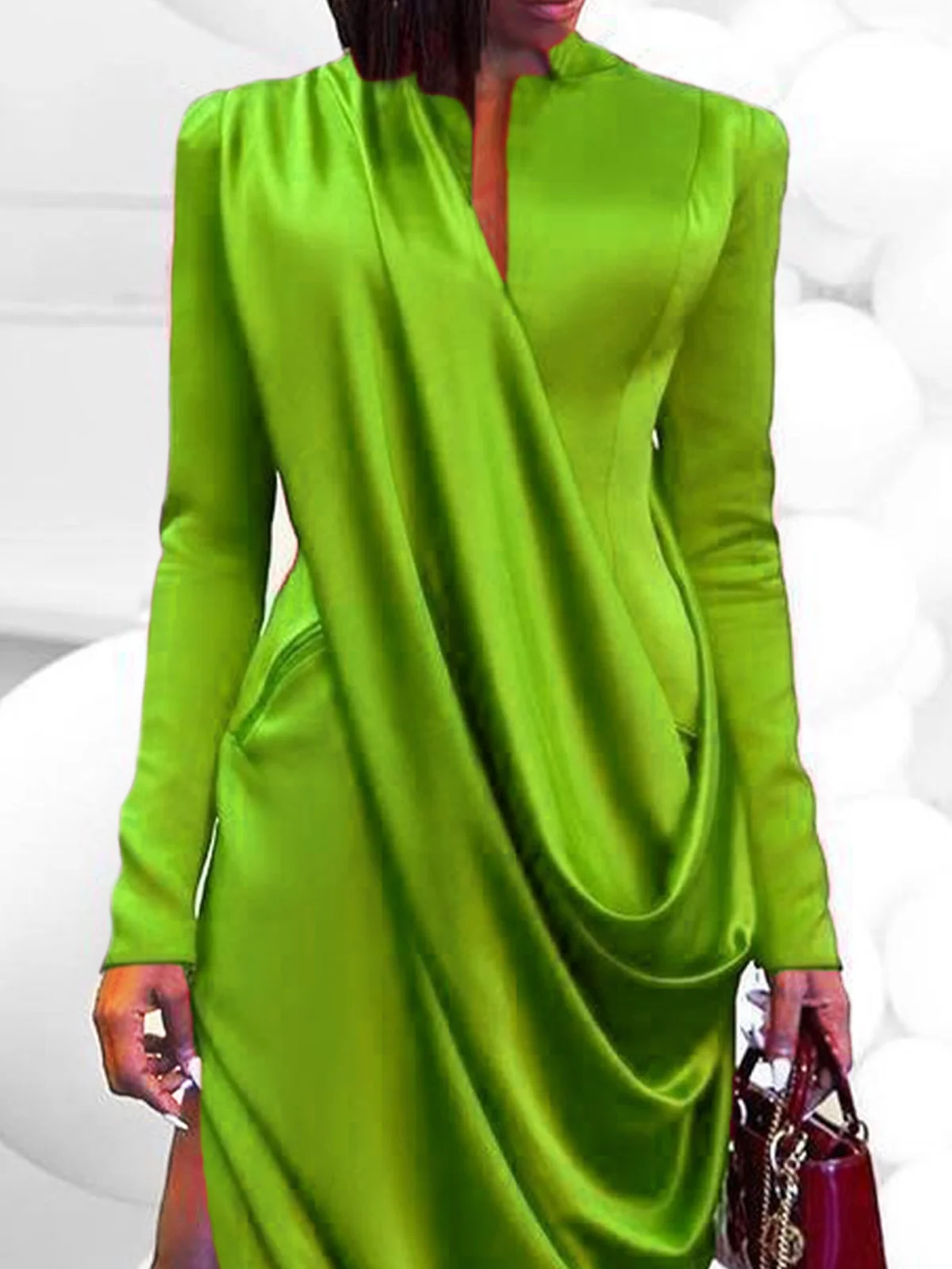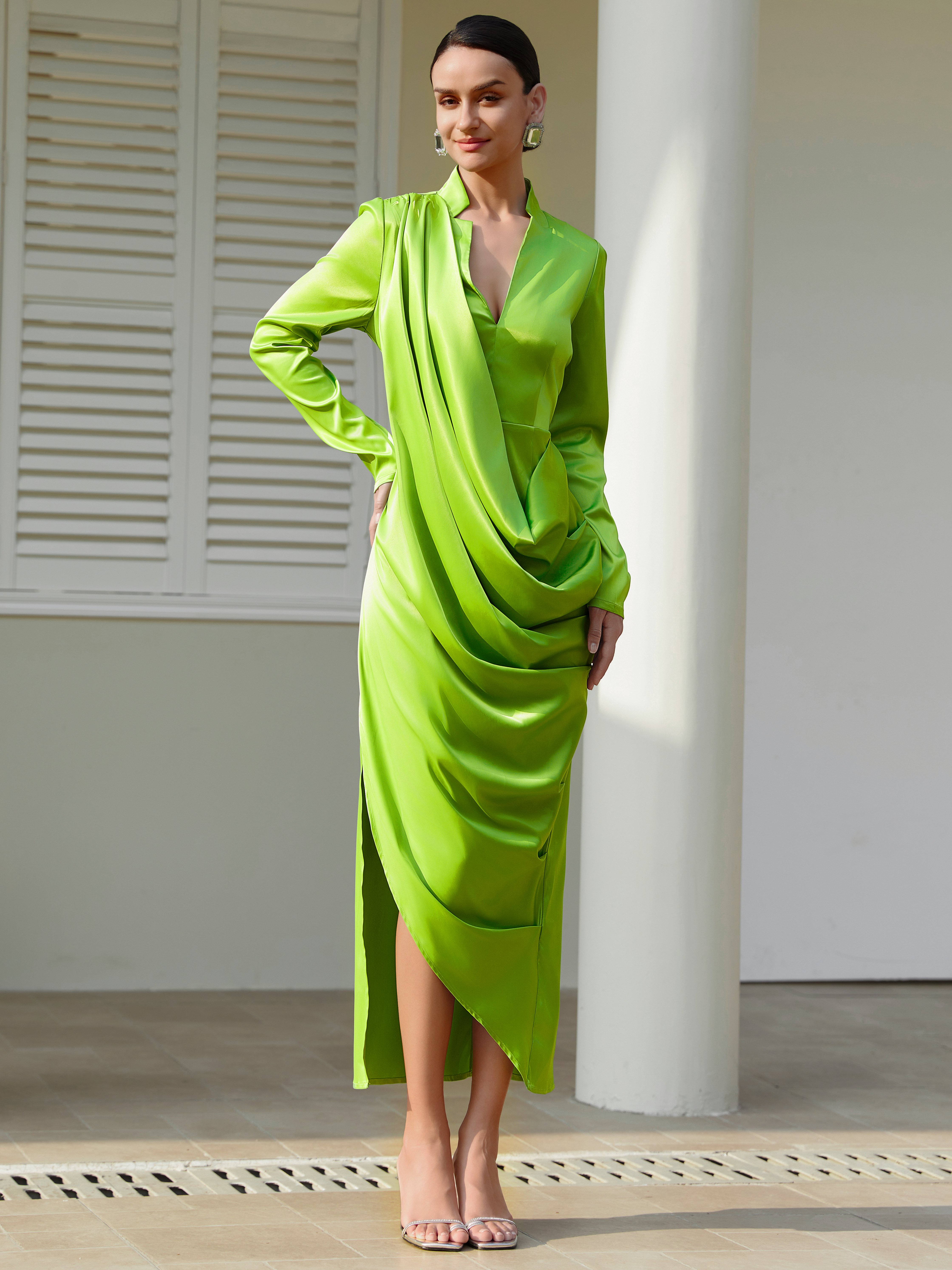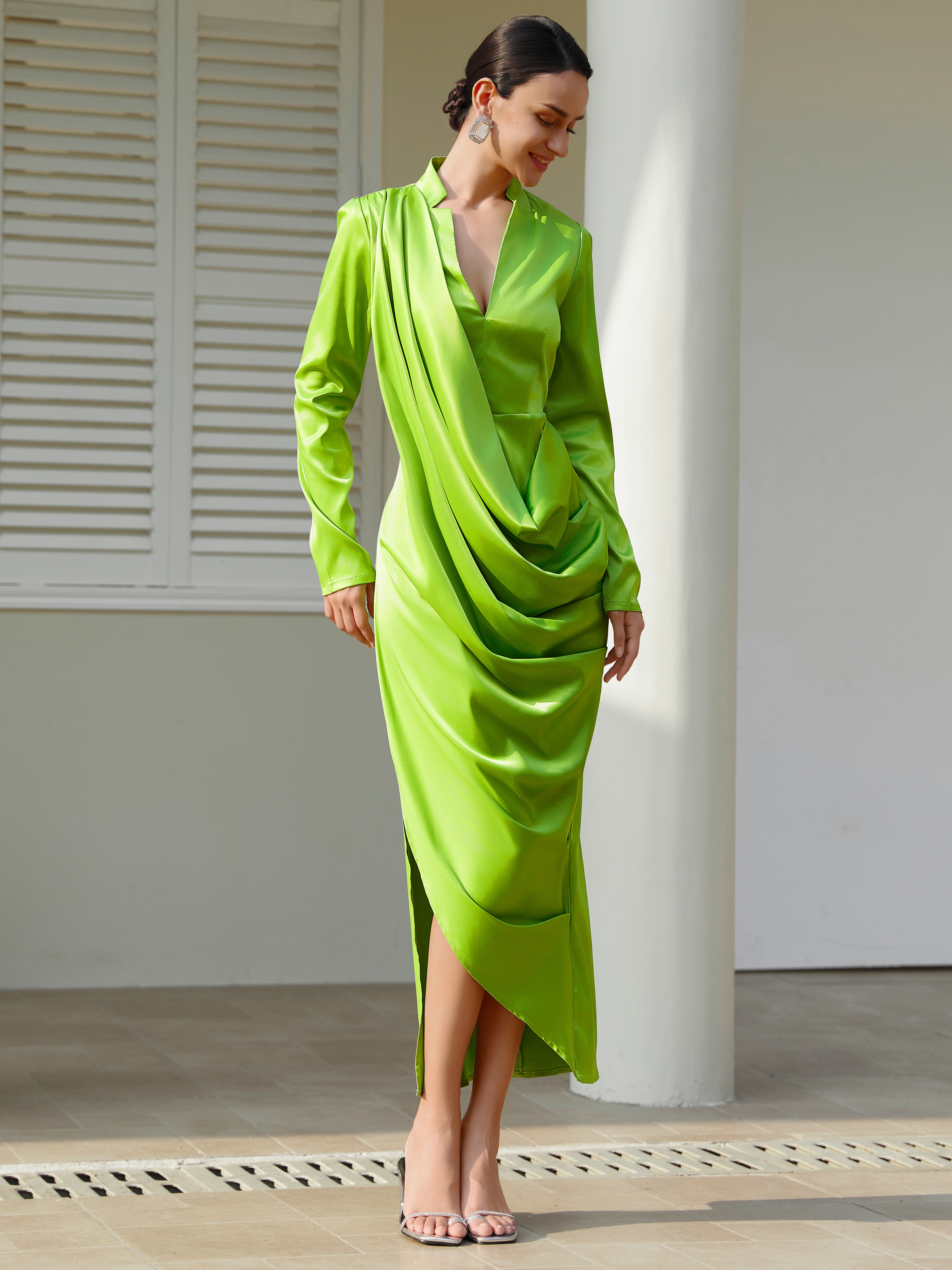 This satin maxi dress is perfect for any party with its elegant design and long sleeves that add a touch of sophistication.