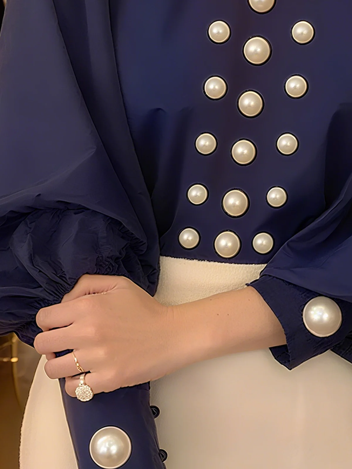 Satin Elegant Plain Imitation Pearls Mock Neck Balloon Sleeve Blouse