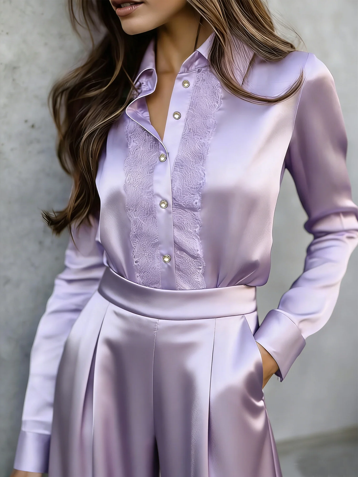 Satin Elegant Plain Lace Edge Shirt Collar  Shirt