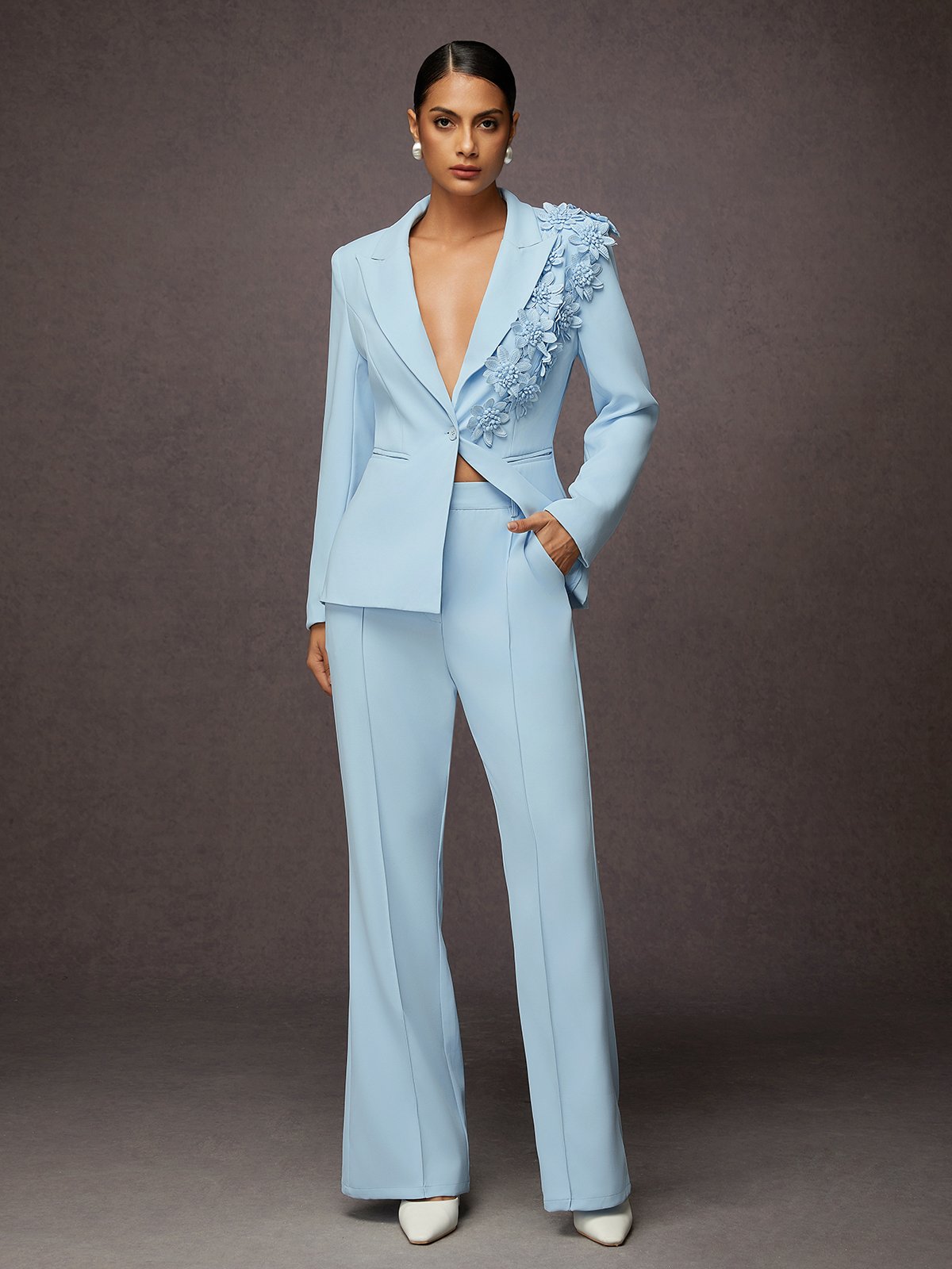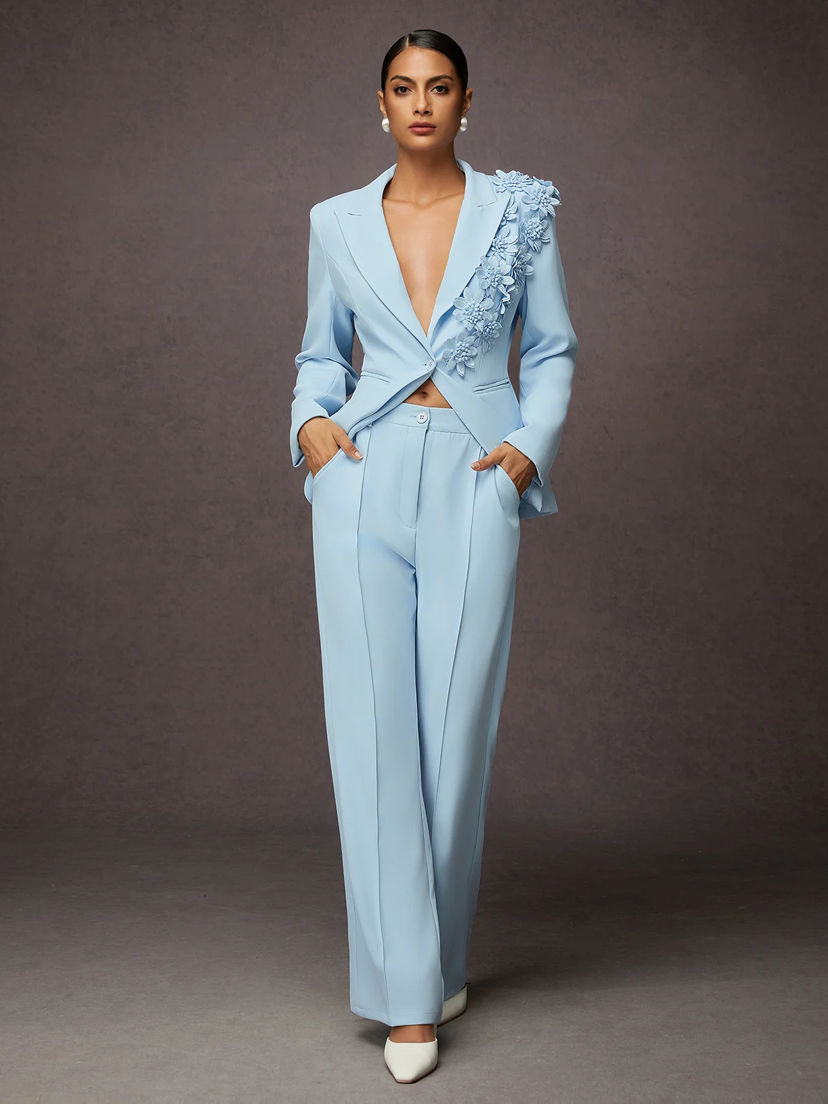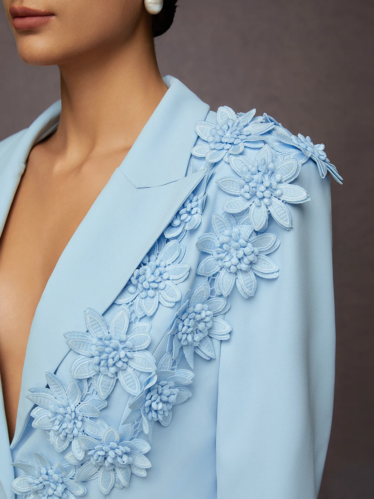 Elevate your style with this best-selling, classic-cut blazer in a refreshing spring/summer hue. Adorned with exquisite 3D floral appliqués, this versatile piece offers a chic and practical wardrobe essential.