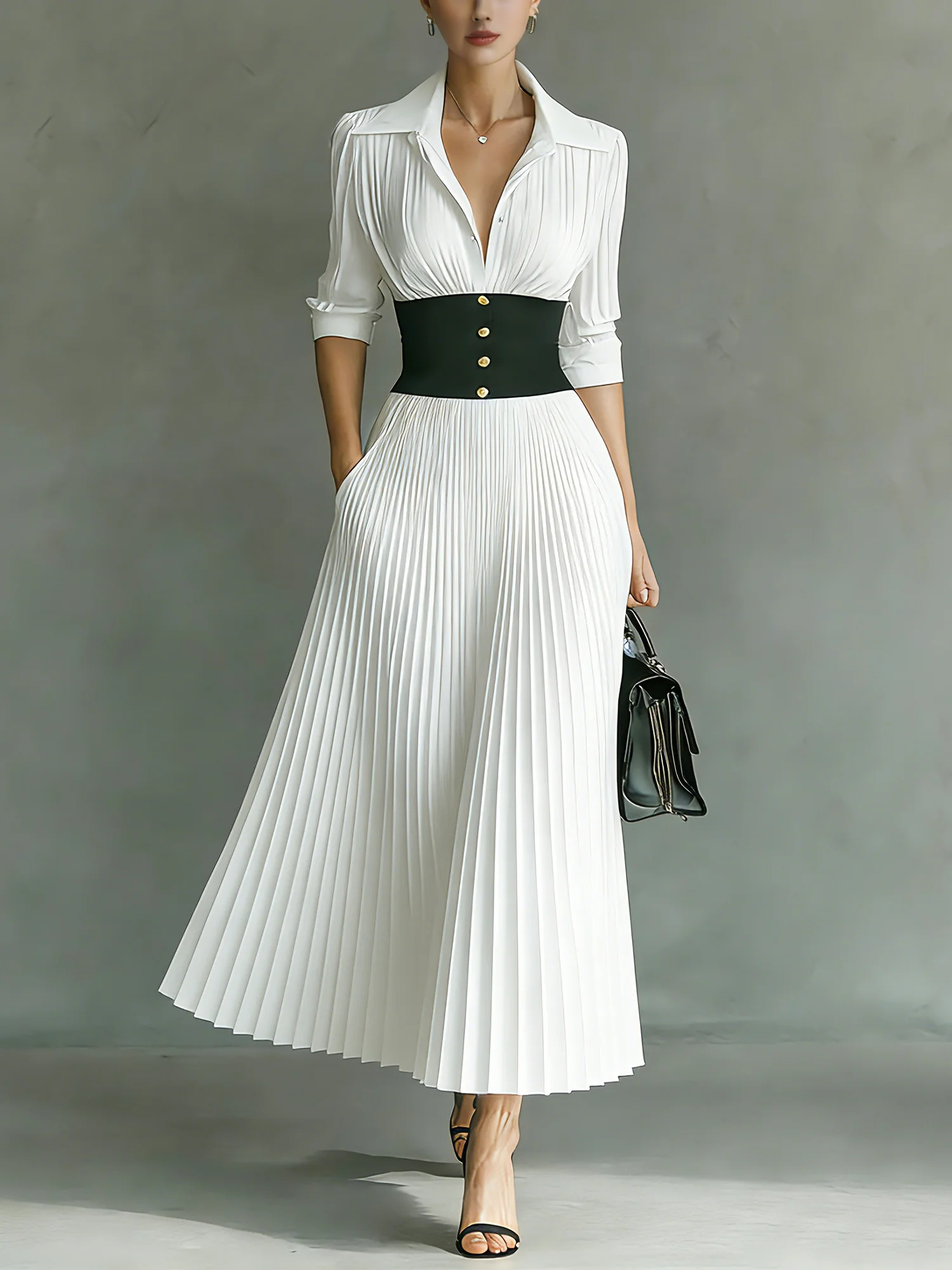 Urban Color Block Pleated Shawl Collar Midi Dress