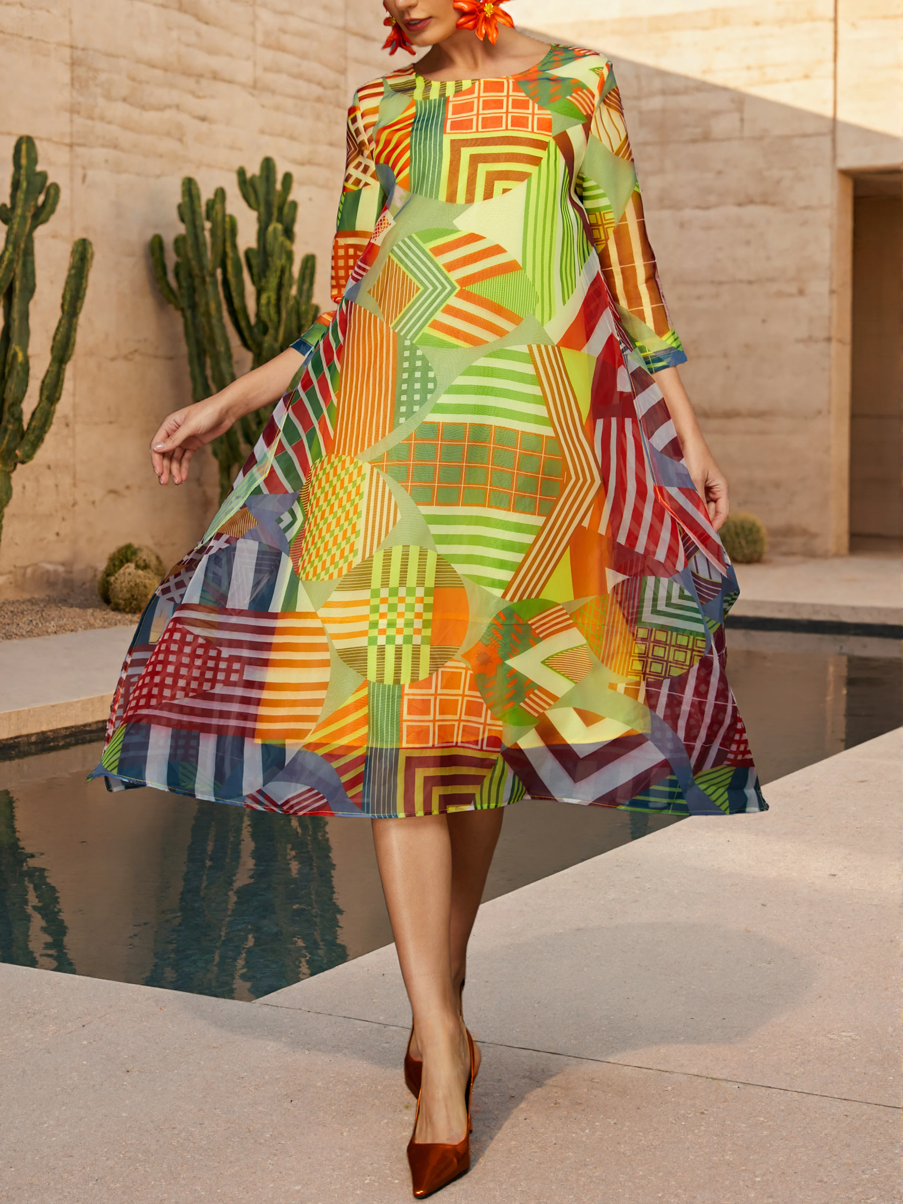 A lightweight 3/4 sleeve dress featuring a vibrant abstract geometric print on airy sheer mesh. The colorful, artistic design creates a head-turning look that is both breathable and stylish for spring festivities.