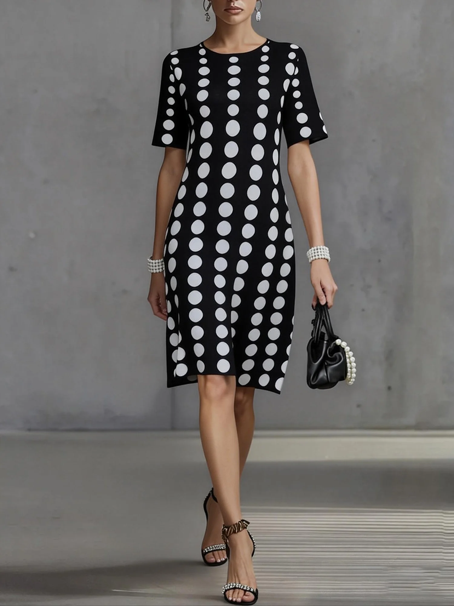 A timeless knit skirt featuring a bold black and white polka dot pattern in a relaxed silhouette. The stretchy knit fabric provides ultimate comfort, making it a versatile piece for both professional settings and casual outings.