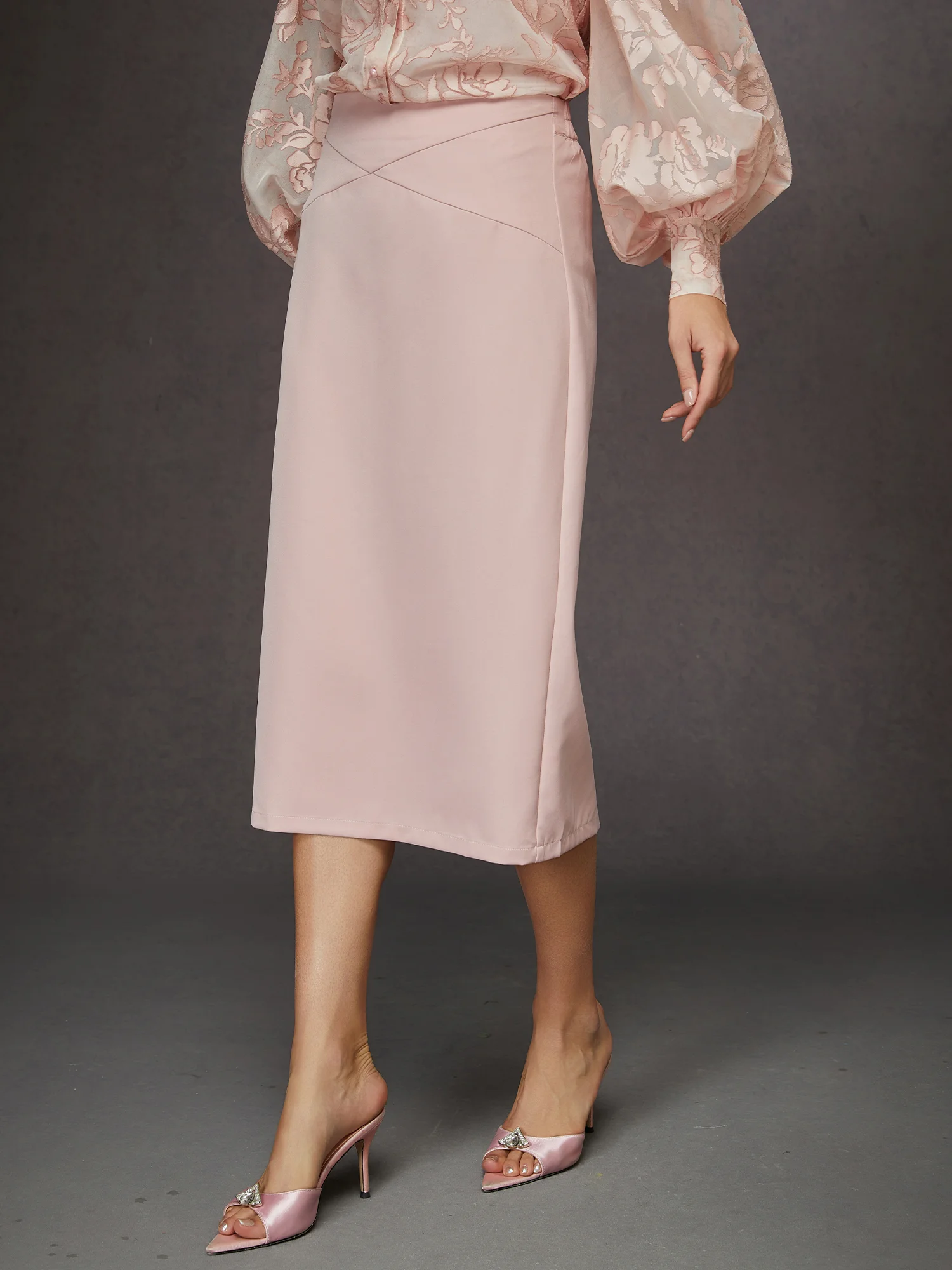 A timeless wardrobe staple, this high-waisted pencil skirt features a precision-tailored fit designed to contour the silhouette. Its clean lines and sophisticated length make it the perfect foundation for any professional or formal ensemble.