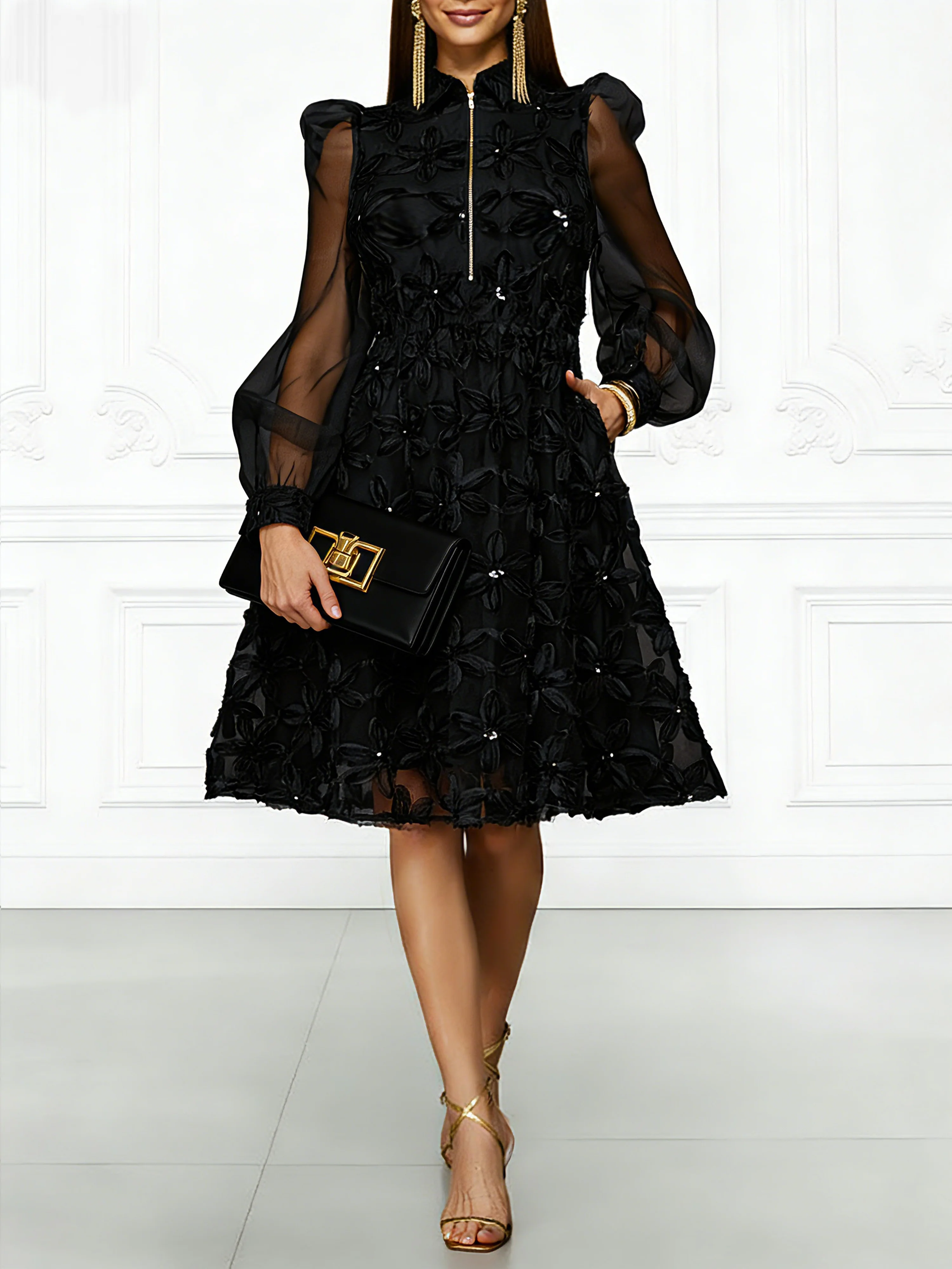 A show-stopping party dress featuring 3D floral appliqu茅s, shimmering sequins, and sheer tulle patchwork. Completed with premium hardware zippers, this gown is designed for red-carpet moments and high-profile celebrations.