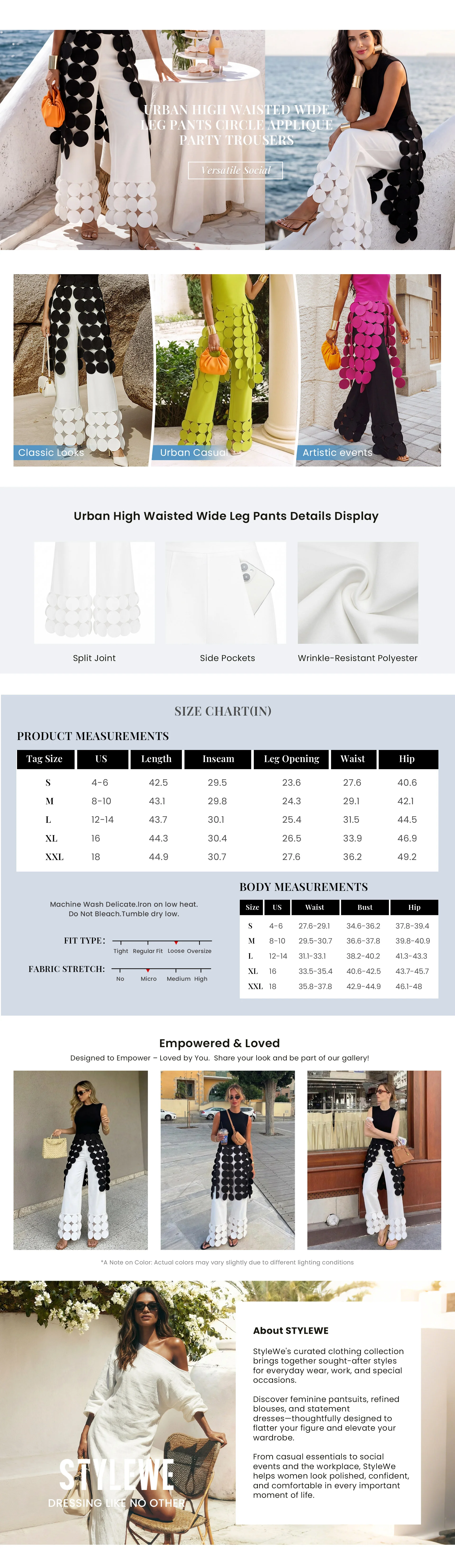 Make an artistic statement with these flowy high-waisted pants featuring dramatic circular applique details. Crafted from lightweight, structured fabric, they are perfect for special occasions or vacations.