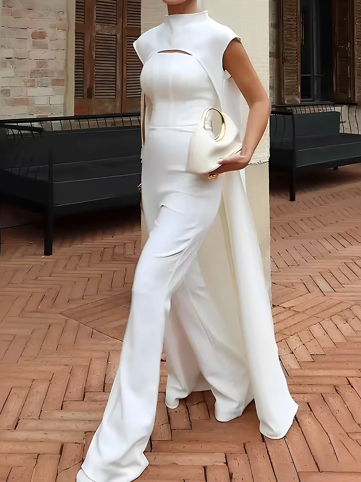 Gracefully designed for sophistication, this tailored white jumpsuit with a flowing cape exudes timeless elegance. Perfect for weddings, galas, and formal events, it offers a flattering fit for confident, stylish women.