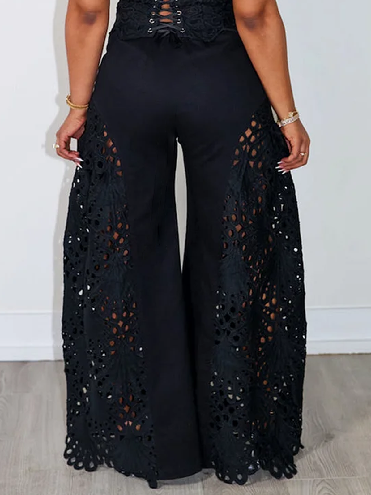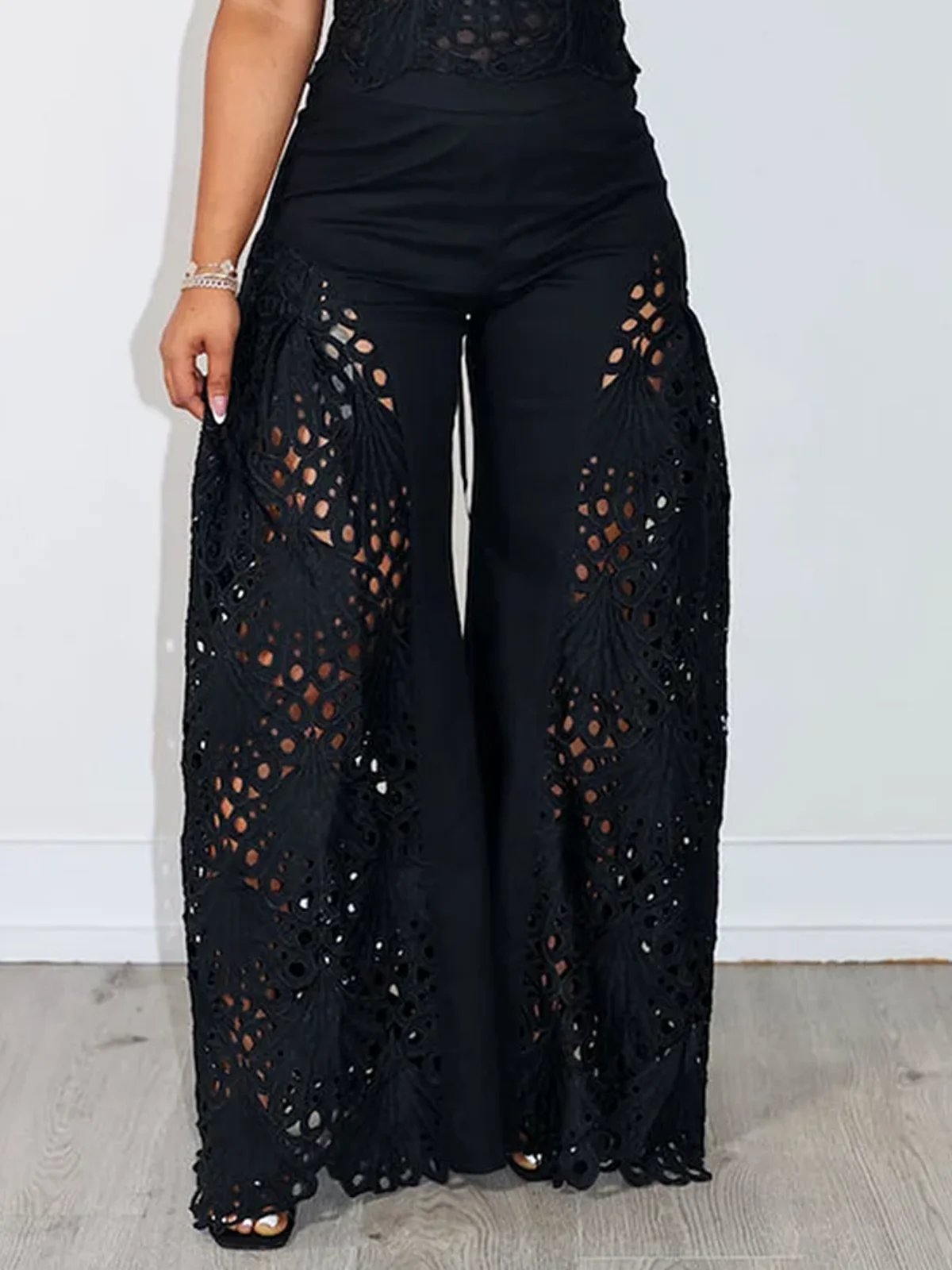 Step out in style with these urban plain hollow wide-leg pants. The unique hollow fabric creates a sophisticated, fashion-forward look. Effortlessly chic and perfect for making a statement.