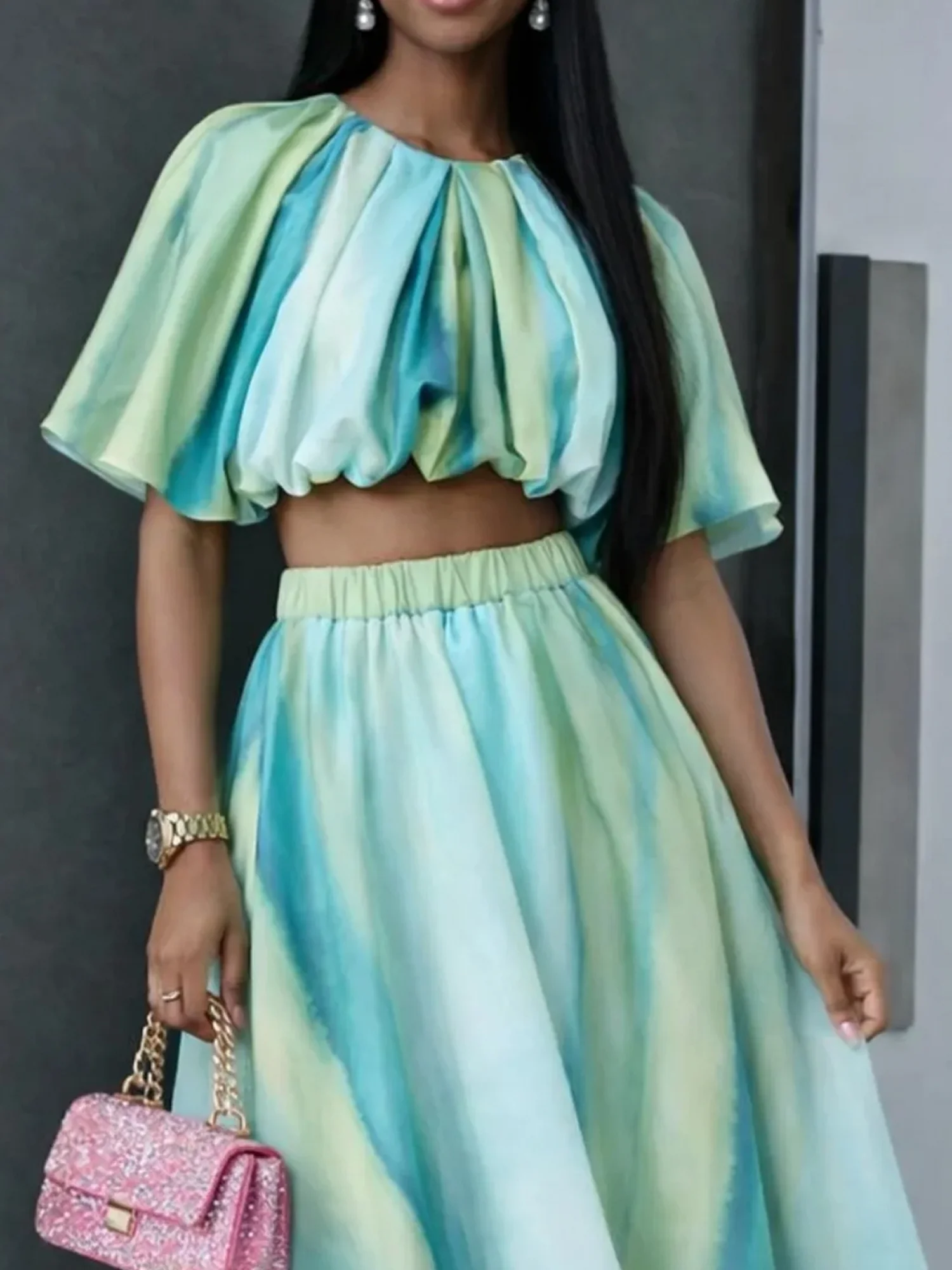 Vacation Gradient Pattern Printing Crew Neck Blouse